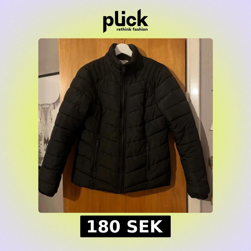 Säljer en svart jacka med krage och hel dragkedja framtill. Jackan har två fickor med dragkedja och quiltad design. Perfekt för kyliga dagar och enkel att matcha med allt.