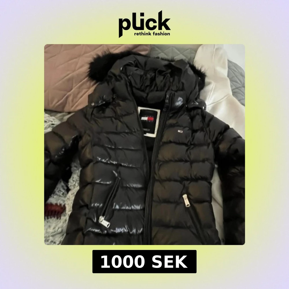 Säljer en svart, glansig pufferjacka från Tommy hilfigher med päls på luvan och snygga dragkedjor. Jackan har quiltad design och en klassisk passform som är både varm och stilren.