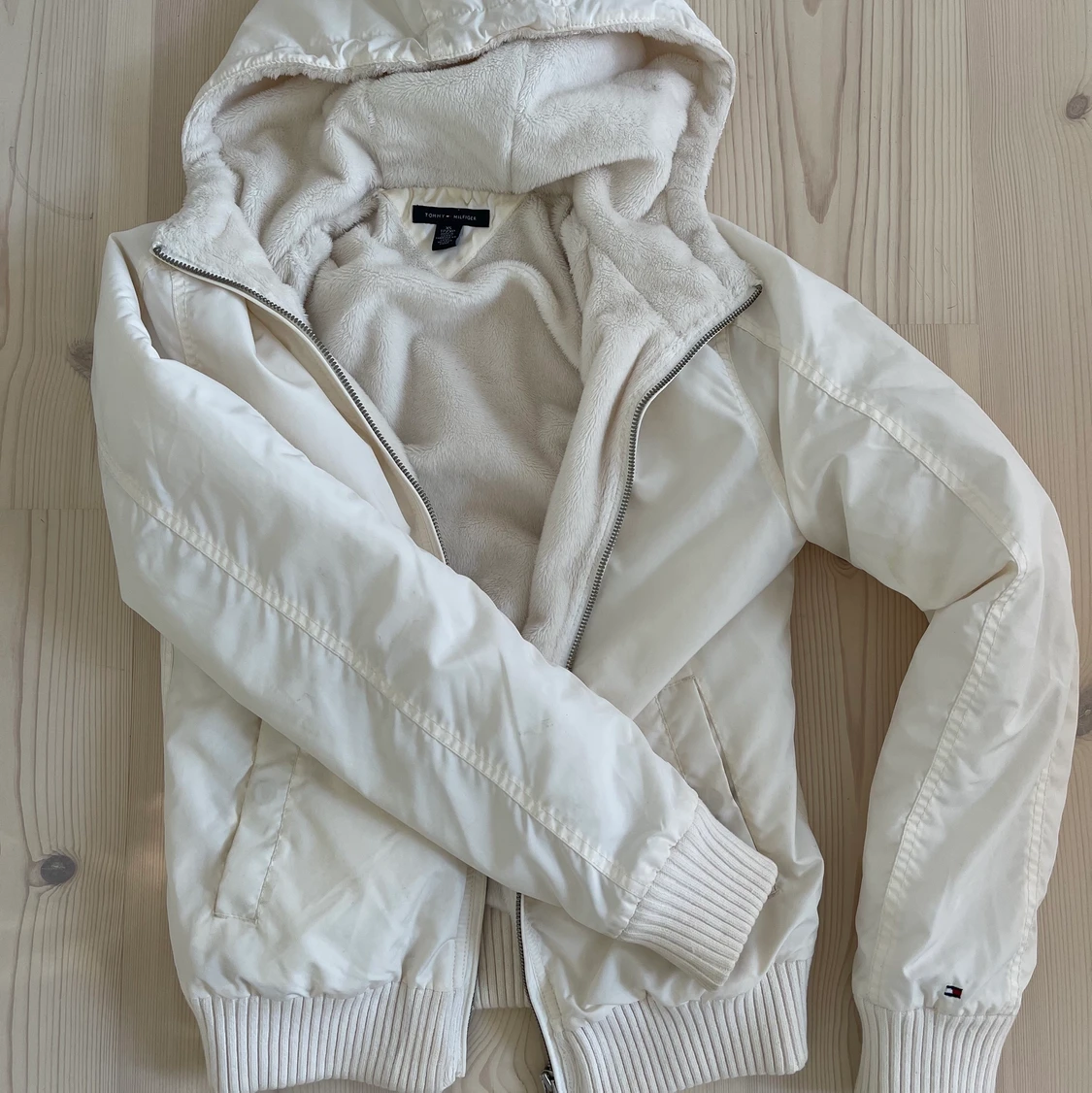 Vit Tommy Hilfiger jacka i storlek xs. Supermysigt material på insidan och ”glansig nylon” på utsidan. Med luva. Använd men i bra skick!