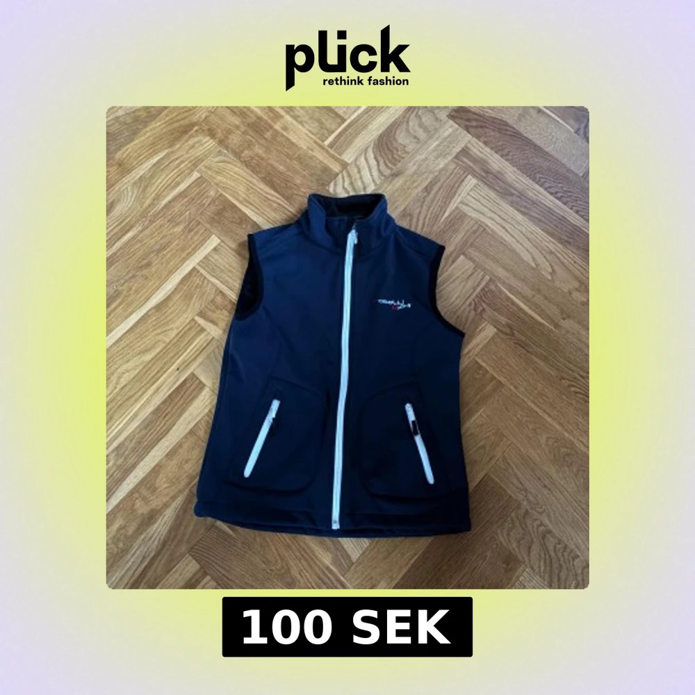 Sportig mörkblå väst från Rosett Riding med vit dragkedja framtill och två fickor med vita dragkedjor. Hög krage och diskret logga på bröstet. Perfekt för ridning och utomhusaktiviteter, tillverkad i mjukt syntetmaterial.