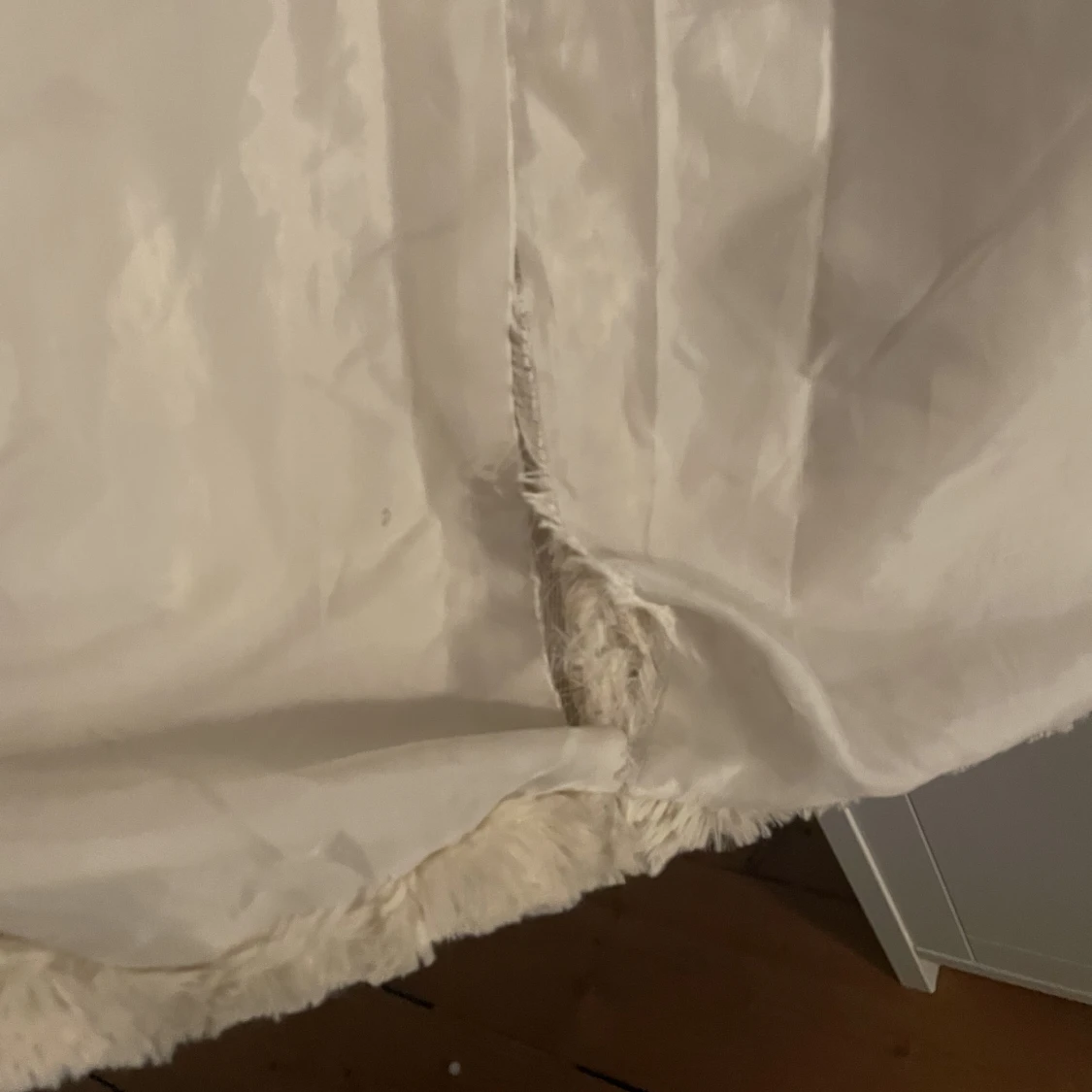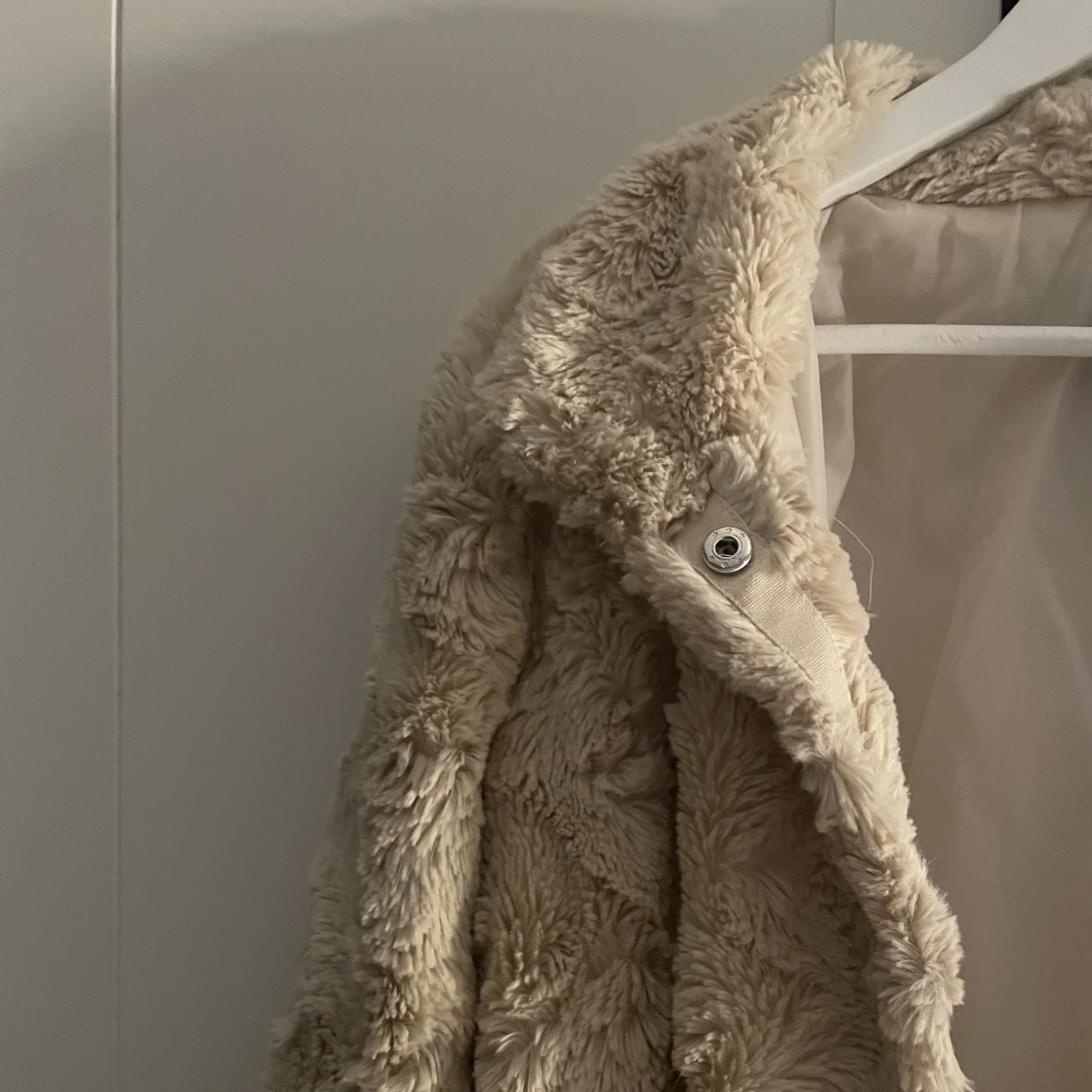 Vit fluffig jacka/kort kappa från vero moda, strl L. Knappt använd. Har en reva på insidan i fodret som säkert går att laga lätt för den händige, men det är inget som syns utvändigt eller påverkar funktionen.