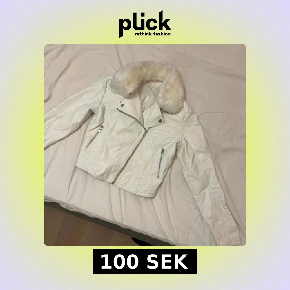 En vit skinnjacka med vit fakepäls. Pälsen är lite missfärgad men det går att ta av den. Köparen står för frakt