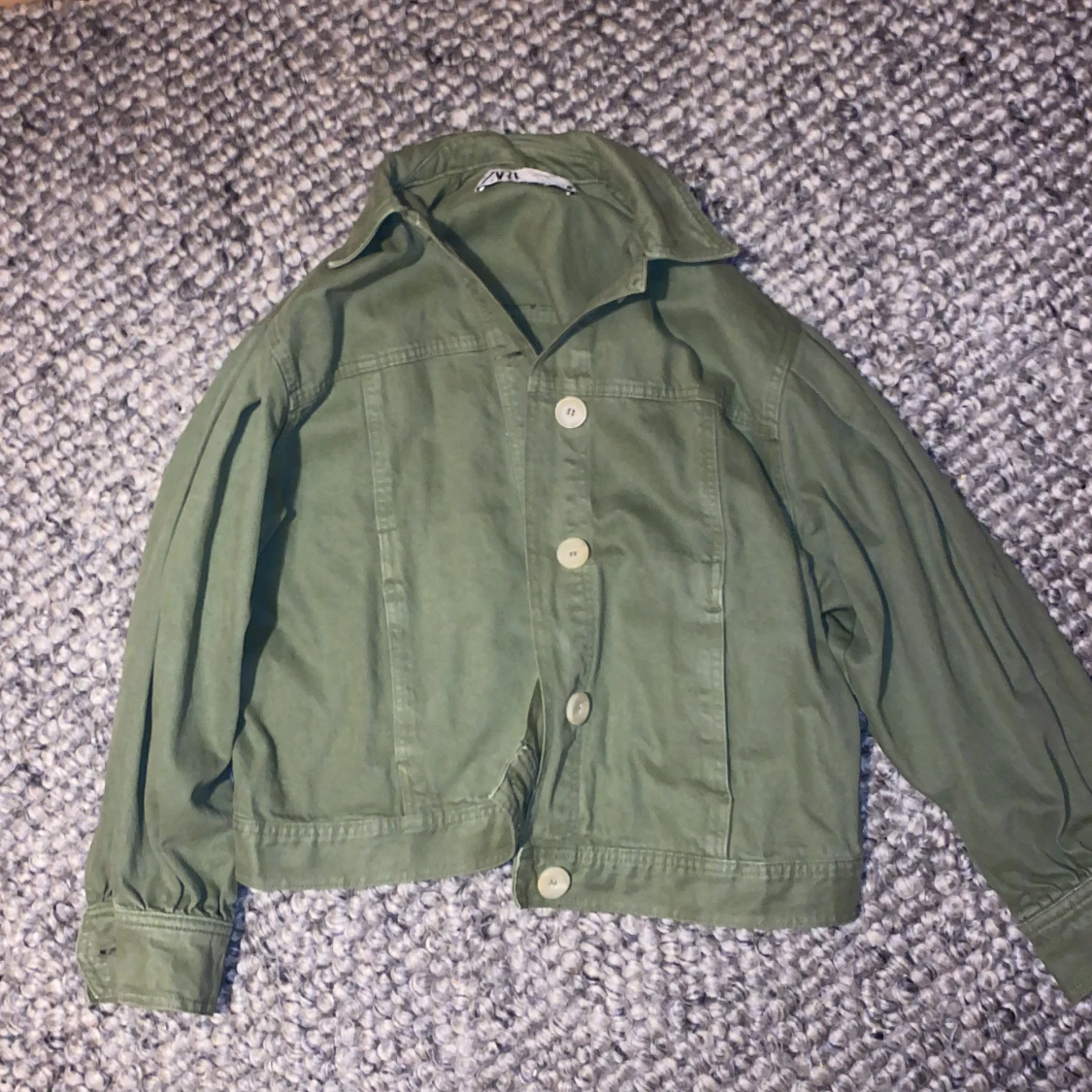 Superfin grön zara jacka i jeanstyg strl M. Aldrig använd, pris kan diskuteras.🫶🏼