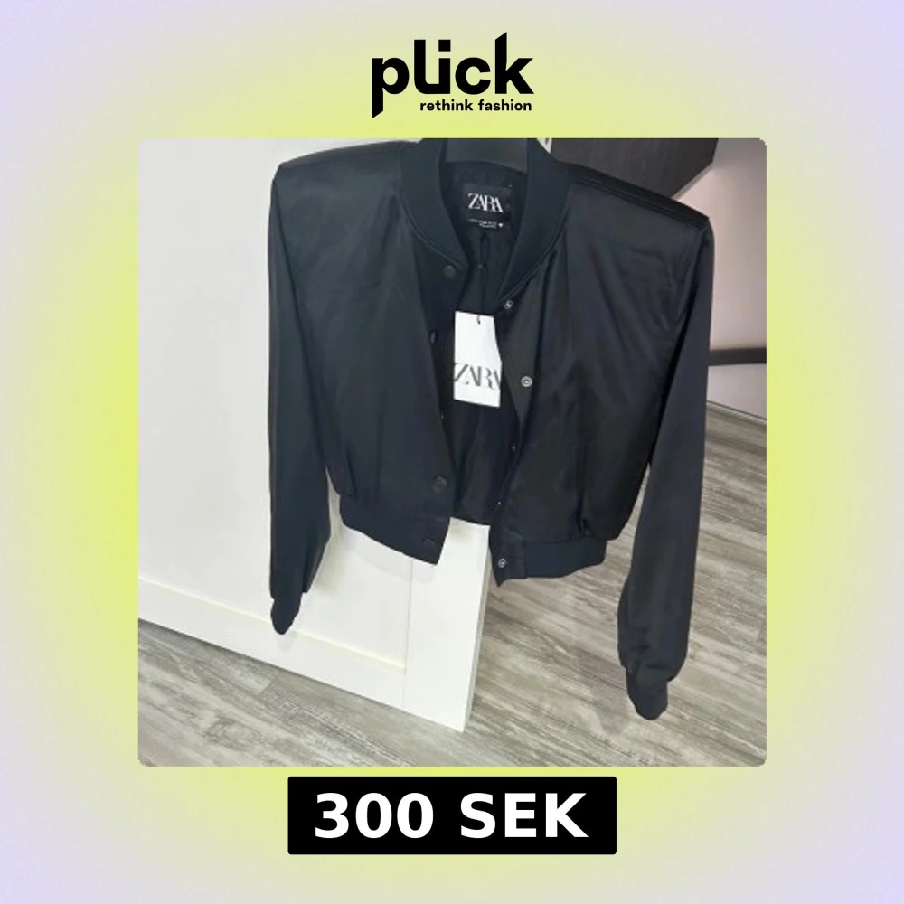 Snygg svart bomberjacka från Zara med klassisk ribbad krage, muddar och knappstängning framtill. Jackan har en croppad passform och är tillverkad i ett slätt, lätt glansigt material som ger en clean look. Perfekt för dig som gillar stilrena och trendiga plagg.