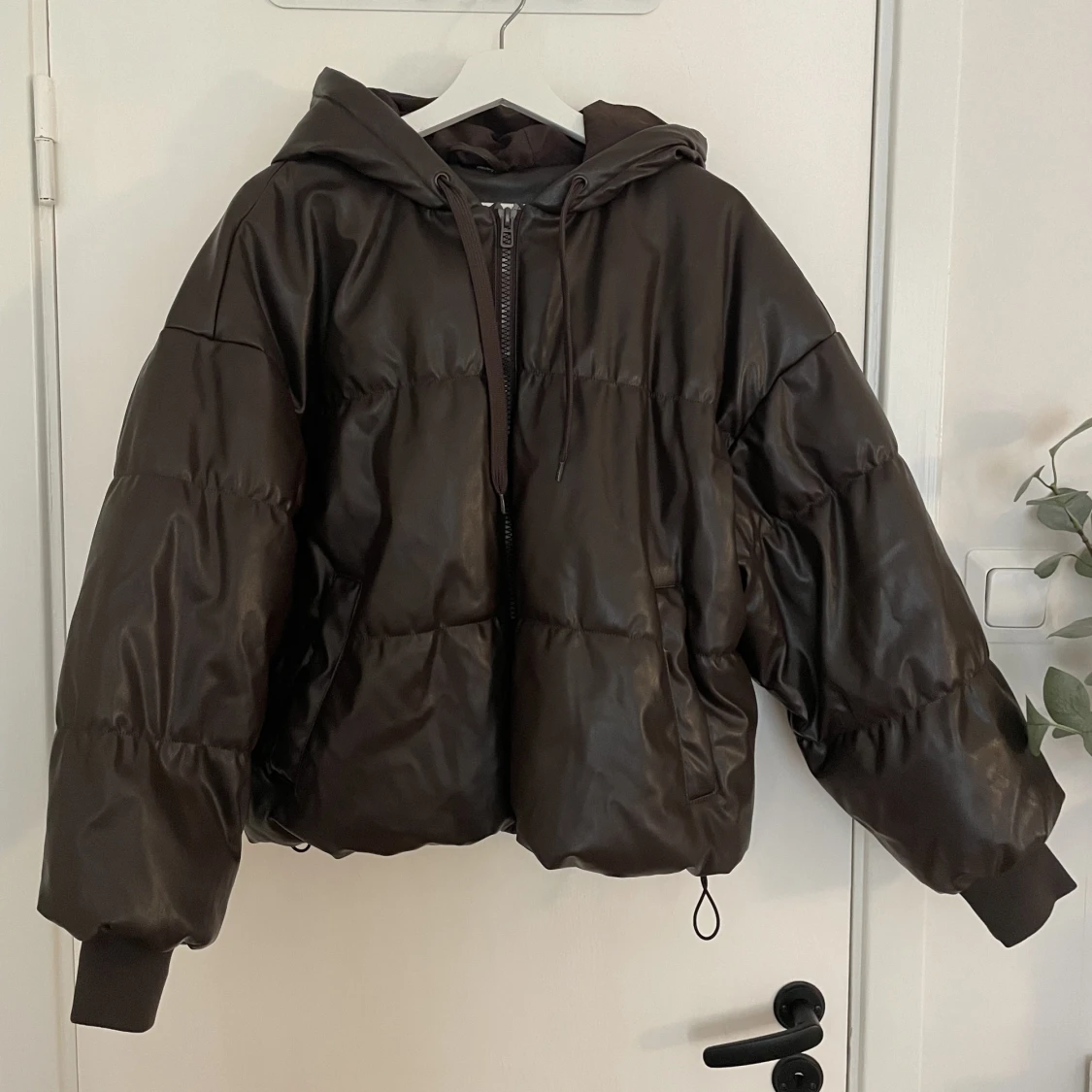 Mörkbrun PU jacka, skitsnygg och knappt använd - lite för vågad för min stil tyvärr. Hoppas den hittar ett nytt hem💓(den sitter oversize på en S)