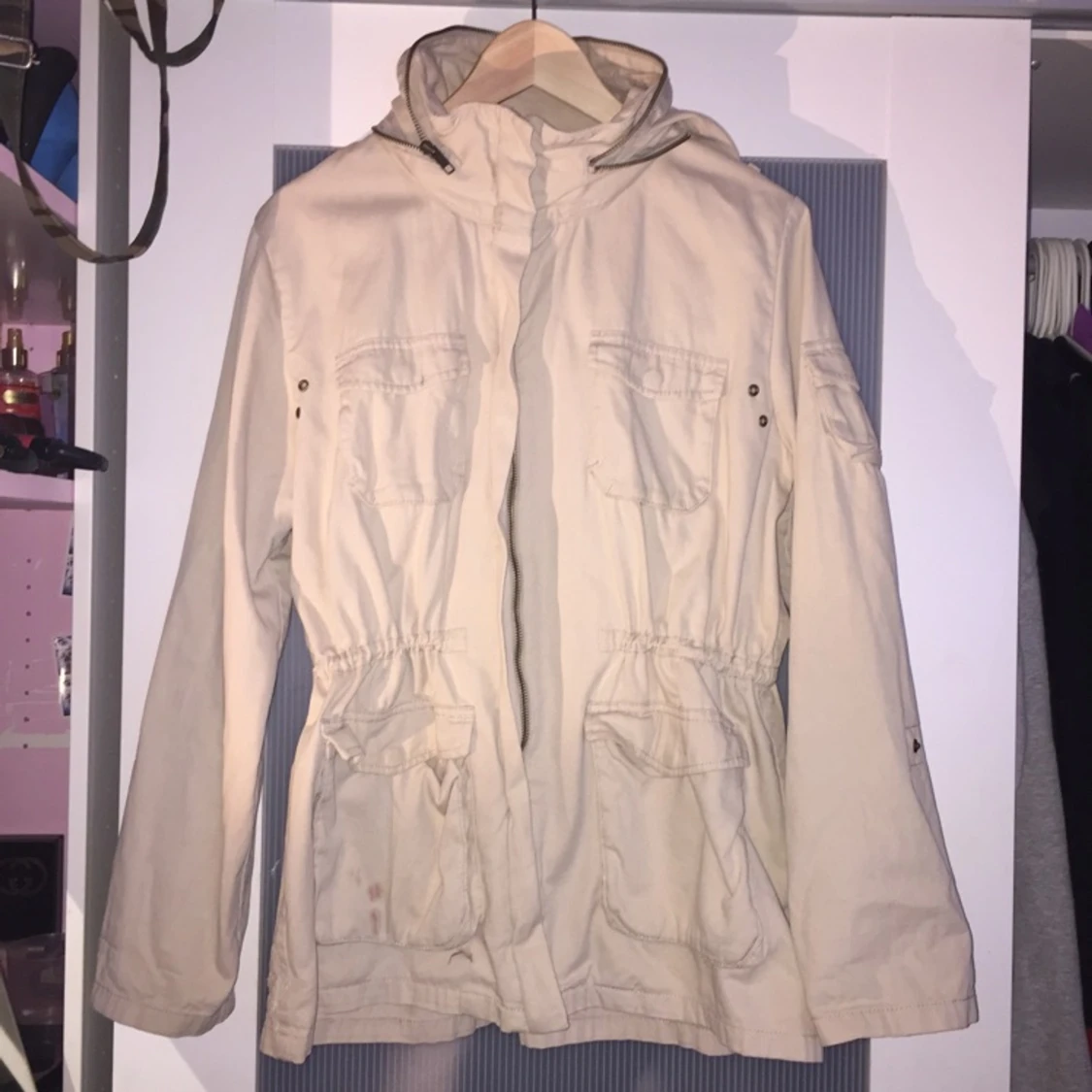 Beige jacka med dragkedja för luvan ifall man inte vill ha luva :) liten fläck vid ena fickan som går att tvätta bort. Kan spännas åt vid midjan men även ha den löst, passar en S, M och L beroende på hur tight man vill ha den :)