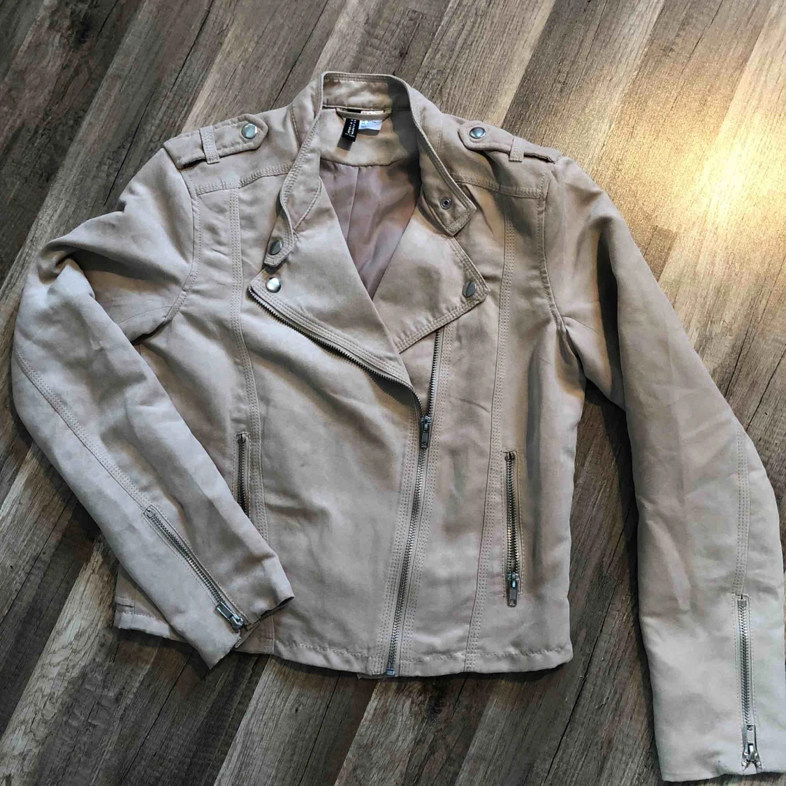Kort beige jacka med 2 olika knäppningar/urringningar i halsen. Som ny. Köparen står för porto