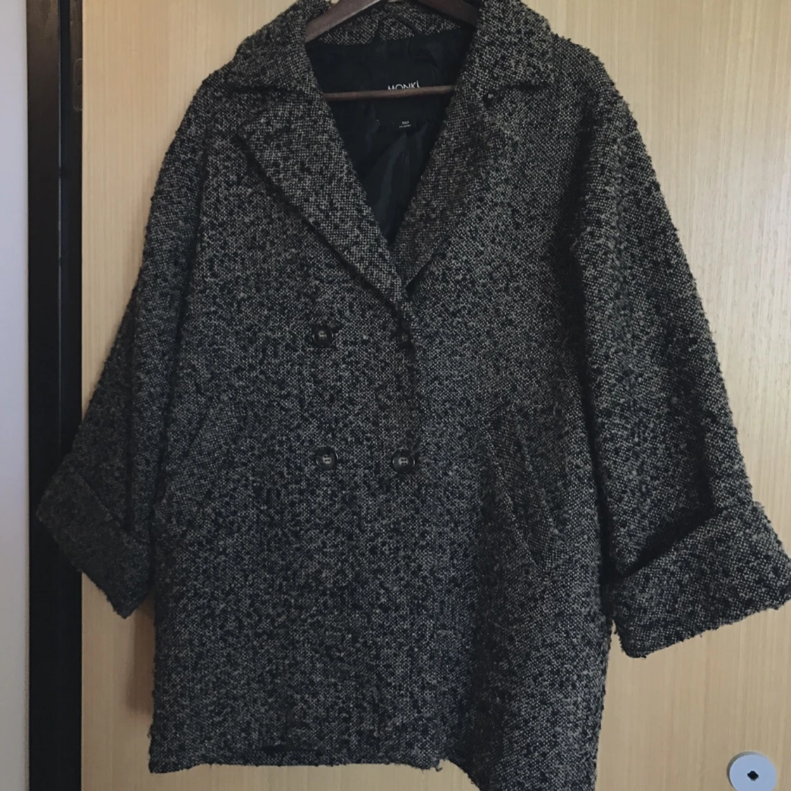 Oversized vår/höst-jacka från Monki. Modell med 3/4-ärm. Gott skick. Jag är normalt i storlek 40-42 men denna sitter perfekt trots märkningen.