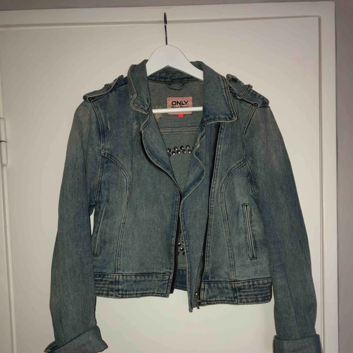 Snygg jeansjacka men coolt motiv på ryggen av nitar. Säljer den då jag inte använder den längre.