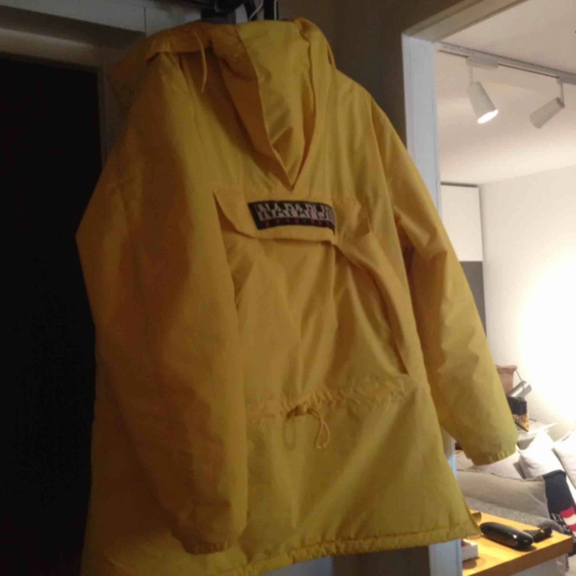 En napaijir jacka gul är mycket varm och skön i minus grader , fryser inte i den , har en öppning på sida. Och en luva samt en fixa i mitten av jackan köpt för ett år sedan är i mycket bra skick nypris 3100kr