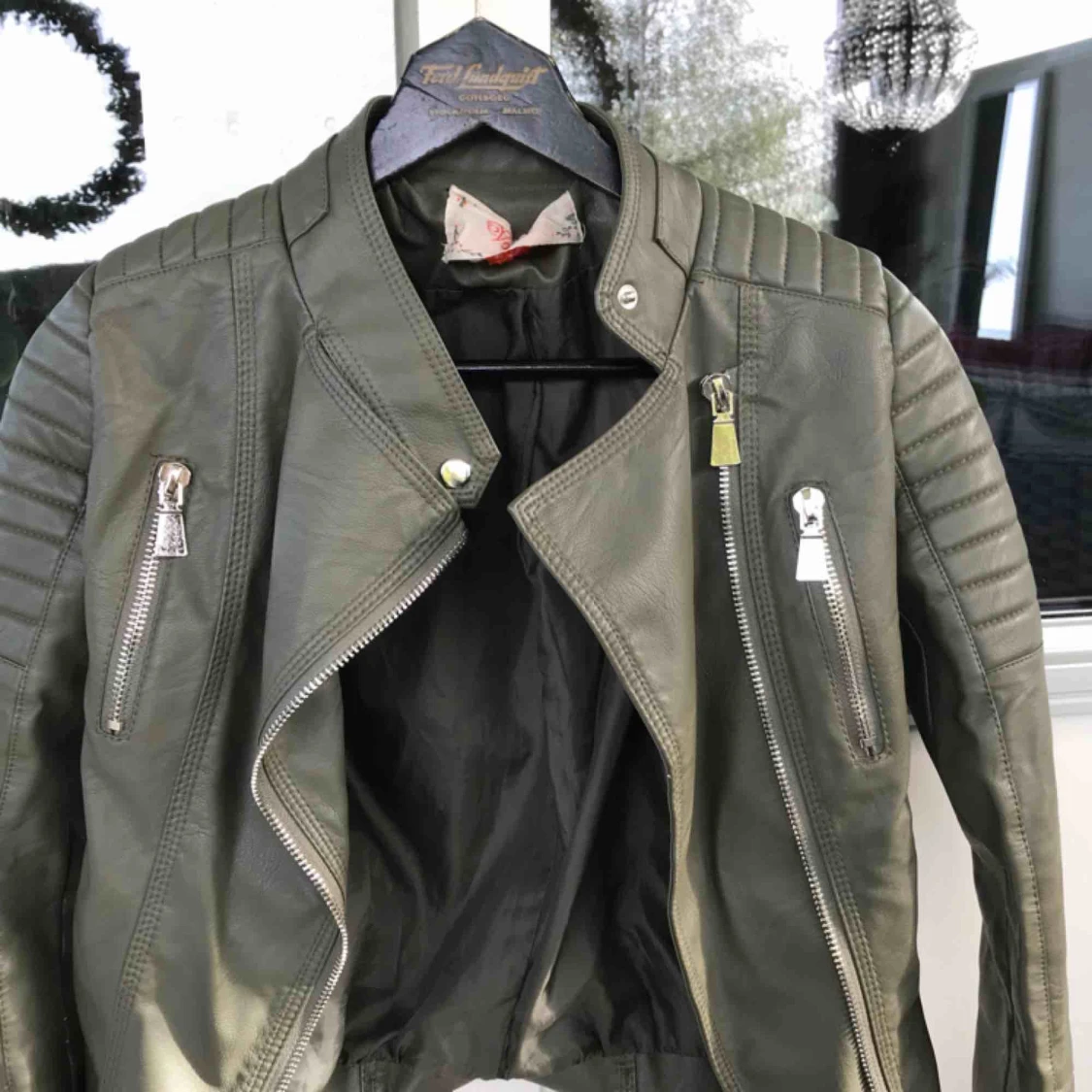 Säljer min gröna skinnjacka. Använd varsamt i 2 säsonger, finns inga märken eller fläckar. Pris 250kr