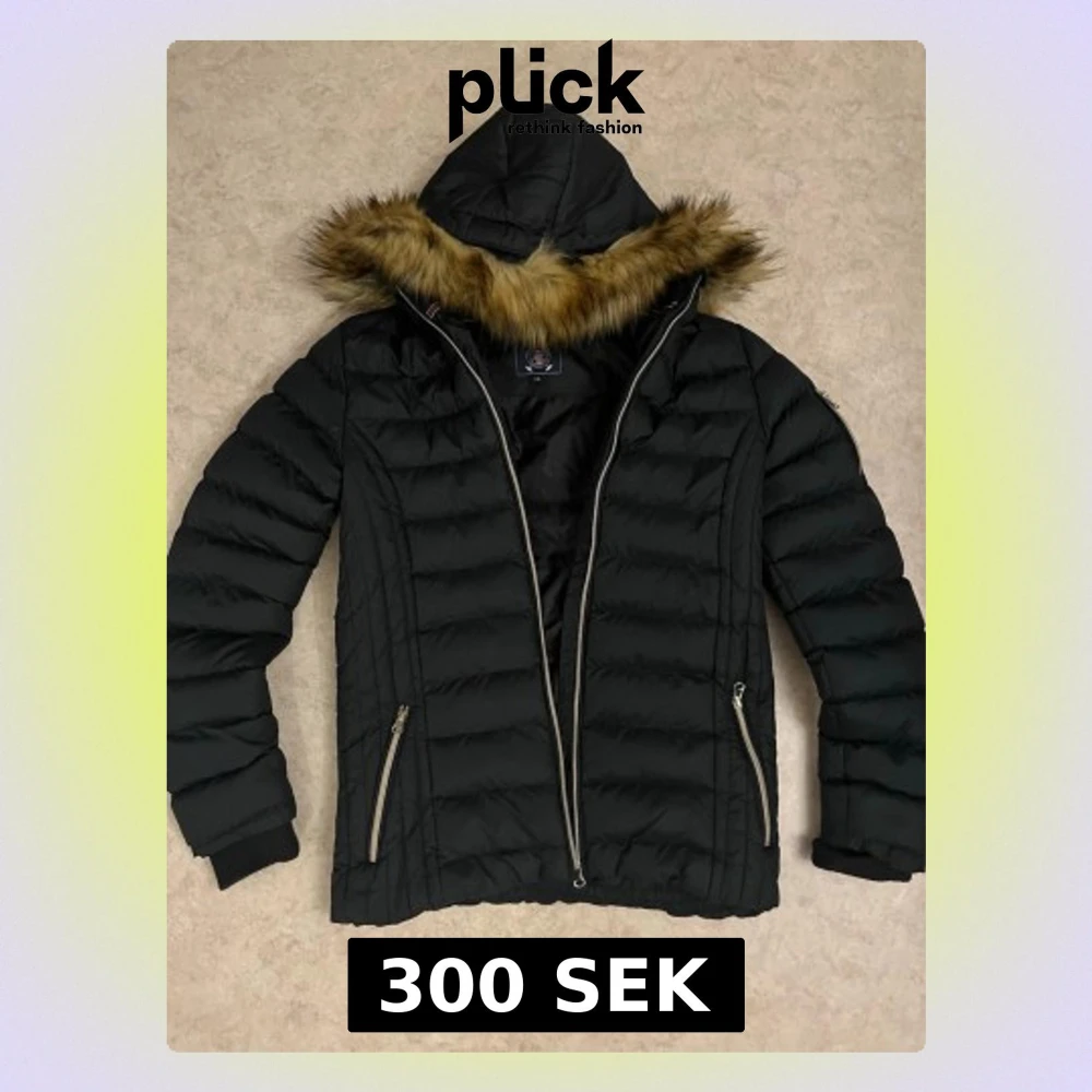 Svart dunjacka från Vinson Polo Club med huva och fejkpäls runt kragen. Jackan har quiltad design, två dragkedjefickor och en snygg patch på ärmen. Perfekt för kalla dagar och riktigt stilren look.
