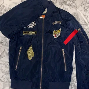 Mörkblå jacka med detaljer, orange inutti, är en M men skulle mer säga S, passar mig som är en XS/S