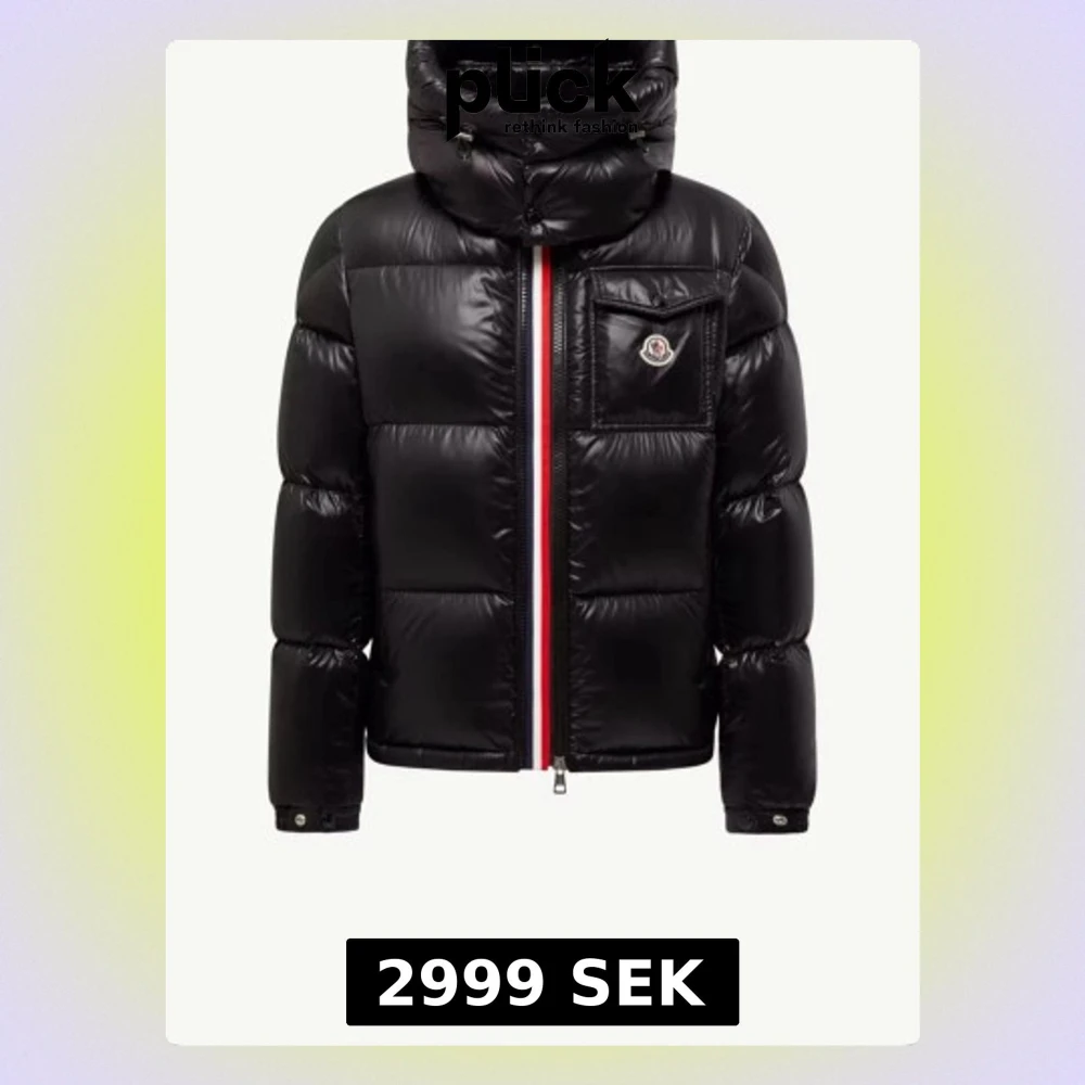 Svart pufferjacka från Moncler med glansig finish, hög krage och huva. Jackan har en röd, vit och blå rand vid dragkedjan, Moncler-logga på bröstfickan och flera praktiska fickor. Materialet är polyester och dun, perfekt för kalla dagar.