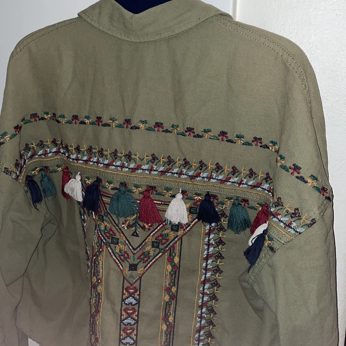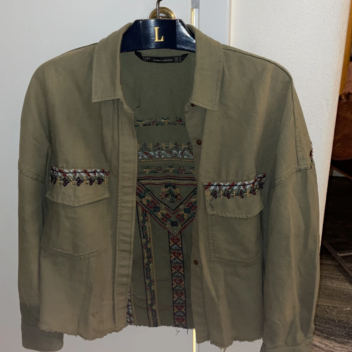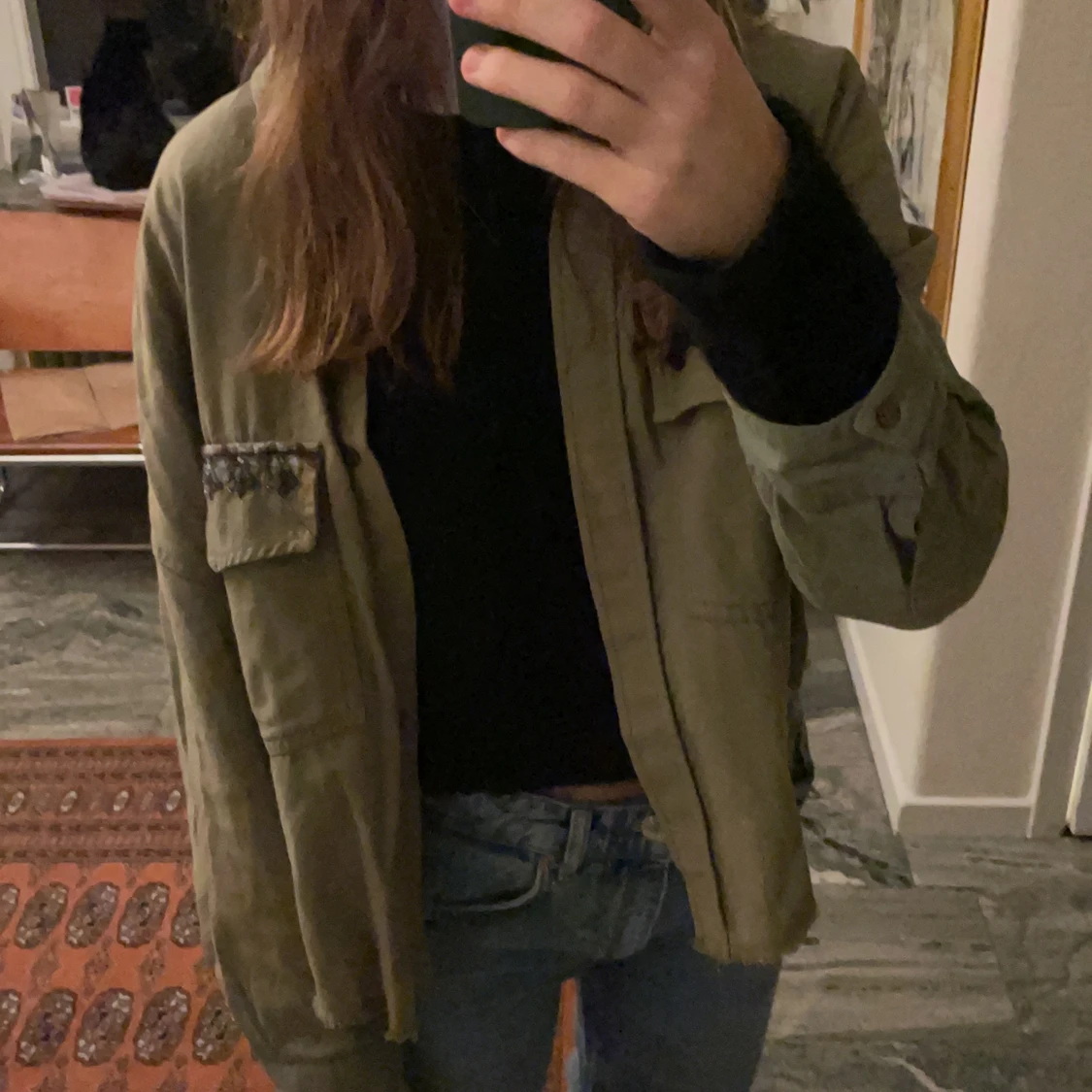 Cool militärgrön skjortjacka med tofsdetaljer på ryggen. Storlek S