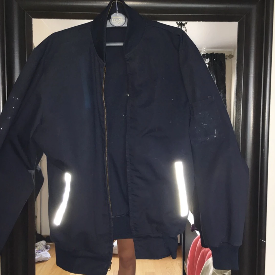 En mörkblå tygjacka. Reflexen vid fickorna. Köpt på beyond retro