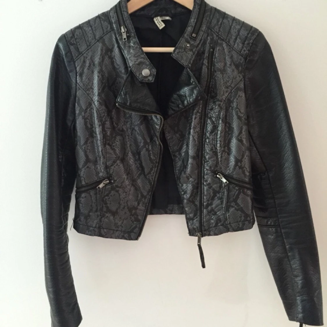 Jacka i fakeläder i ormimitation. Köpt på H&M divided för några år sedan. Är använd rätt så mycket men lika fin för det. Kan mötas upp och tar swish.