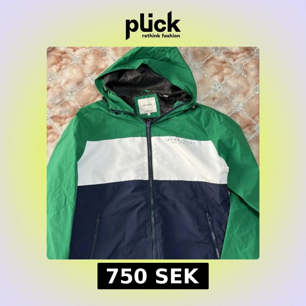 Snygg vindjacka från Jack & Jones i storlek L. Jackan har färgblock i grönt, vitt och mörkblått, huva och hel dragkedja framtill. Tillverkad i lätt polyester, perfekt för blåsiga dagar. Två fickor med dragkedja och sportig look.
