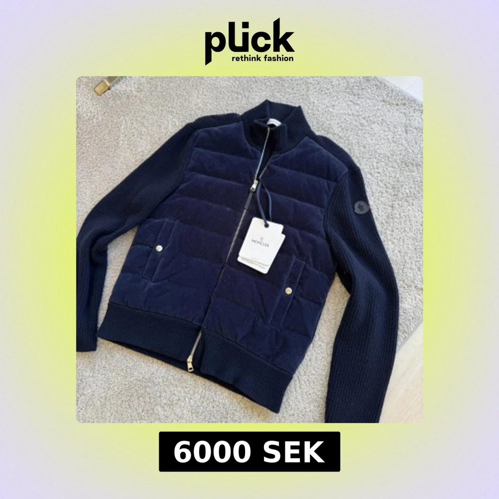 Snygg mörkblå cardigan jacka från Moncler med quiltad front i manchester och stickade ärmar. Jackan har dragkedja, två fickor med tryckknappar och Moncler-logga på ärmen.