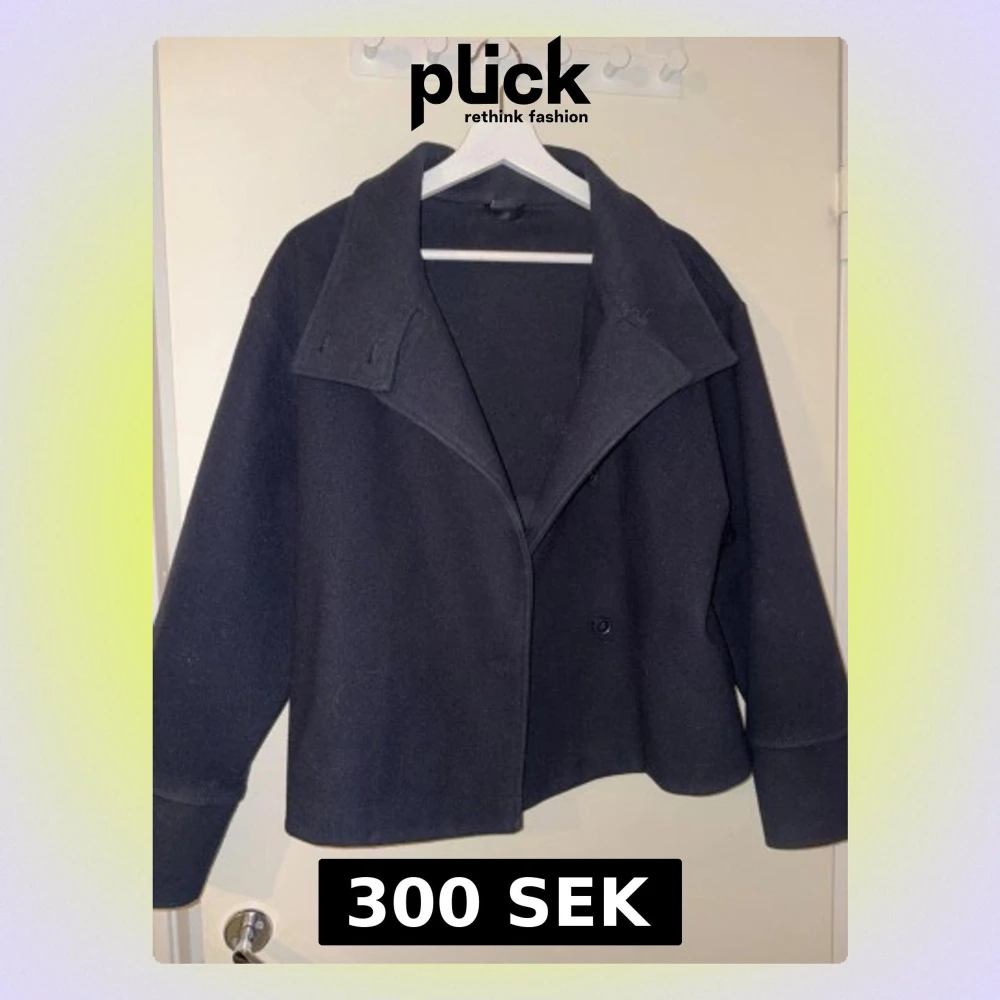 Säljer en mörkblå kappa med knäppning framtill. Jackan har en loose passform och långa ärmar, perfekt för kyligare dagar. Enkel och stilren design som funkar till många outfits.