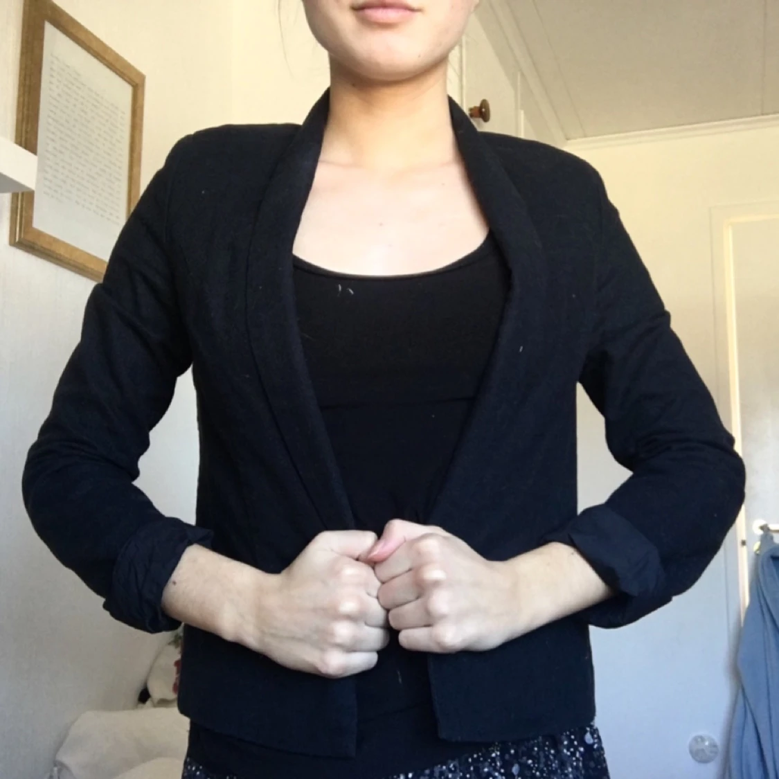 Figursydd svart kavaj med enkel knäppning! Passar även mig som har stl XS. (Ostruken på bilderna). Köparen står för frakten!