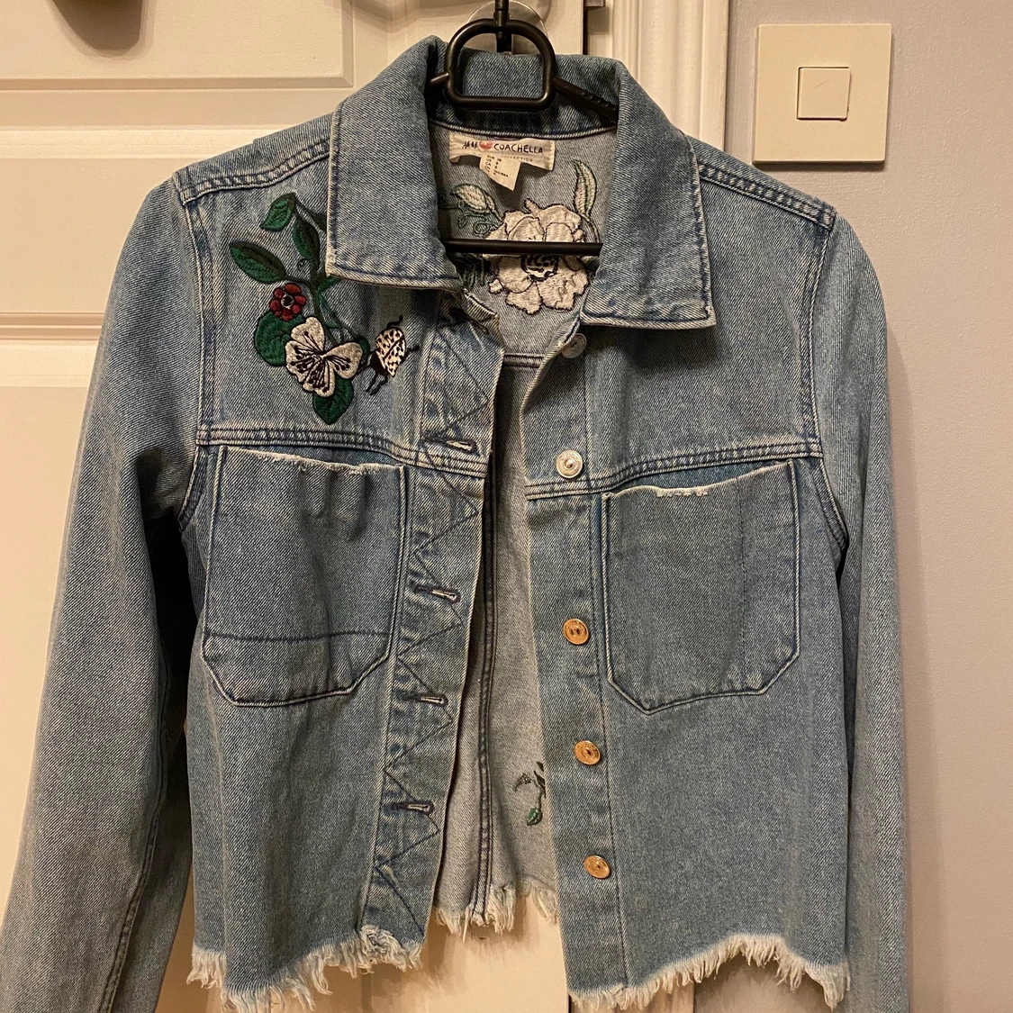 Jeansjacka från H&M men tryck på båda bak och framsida av en ros. Storlek M. Använd ett fåtal gången men skicket är gott som nytt. Säljer pågrund av att jag inte har någon användning för den.