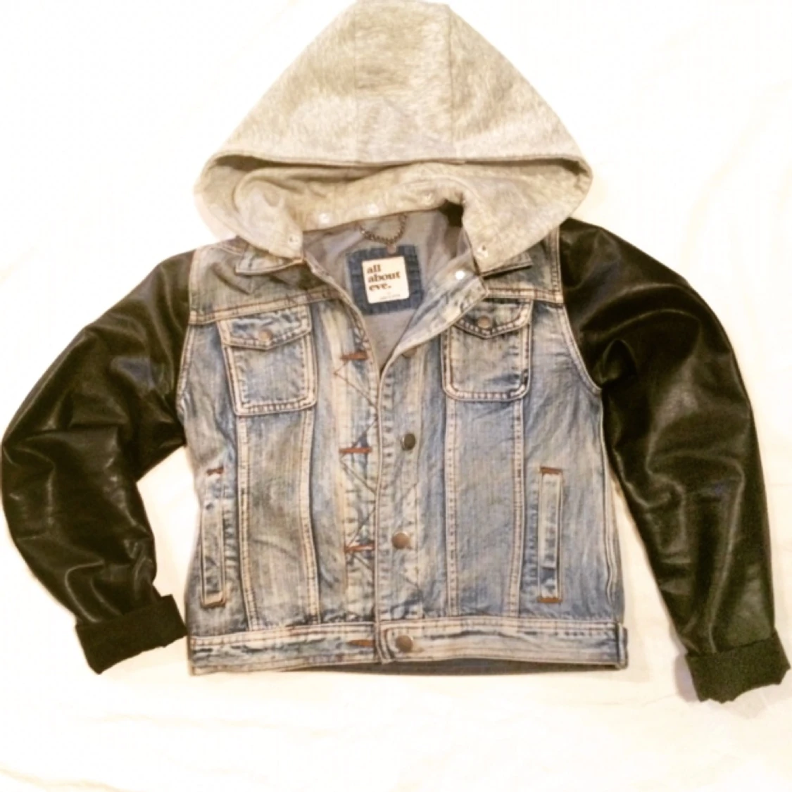Cool jeansjacka med läderarm och grå tyg luva som går att ta av. Från Australien!