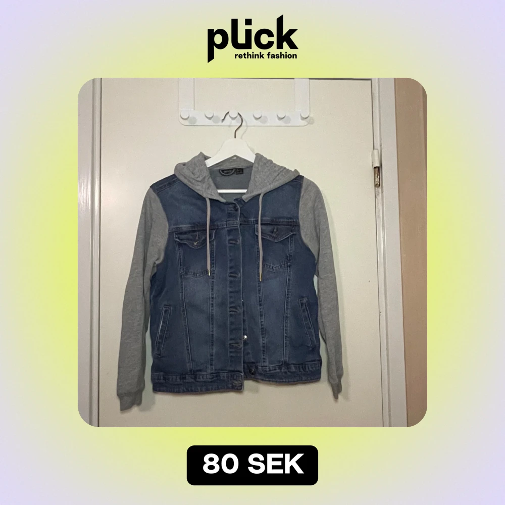 Säljer en cool jeansjacka från Lidl med grå huva och ärmar i sweatshirtmaterial.