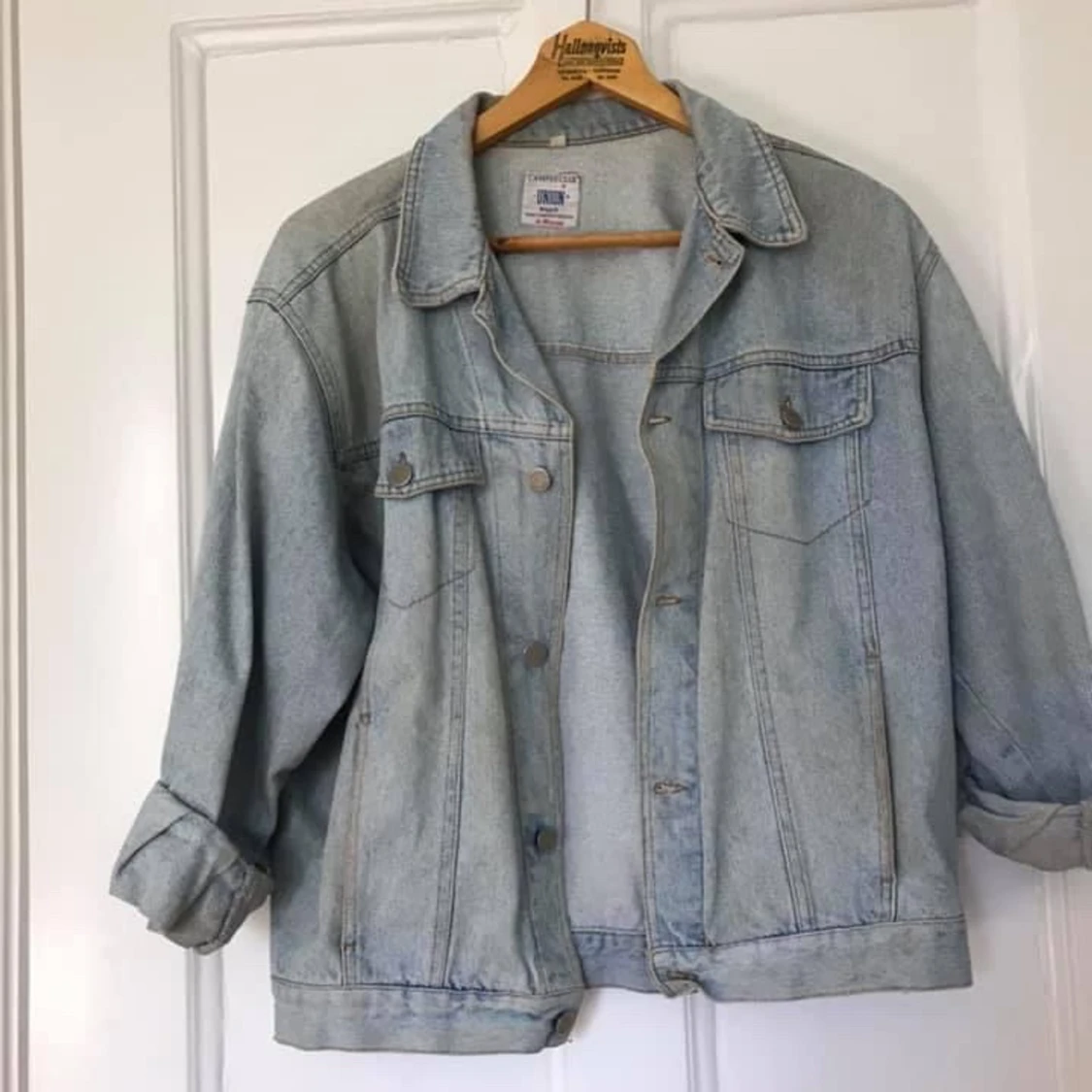 vintage jeansjacka, köpt second hand. snyggt oversized, ljus tvätt. uppskattar till strl 40