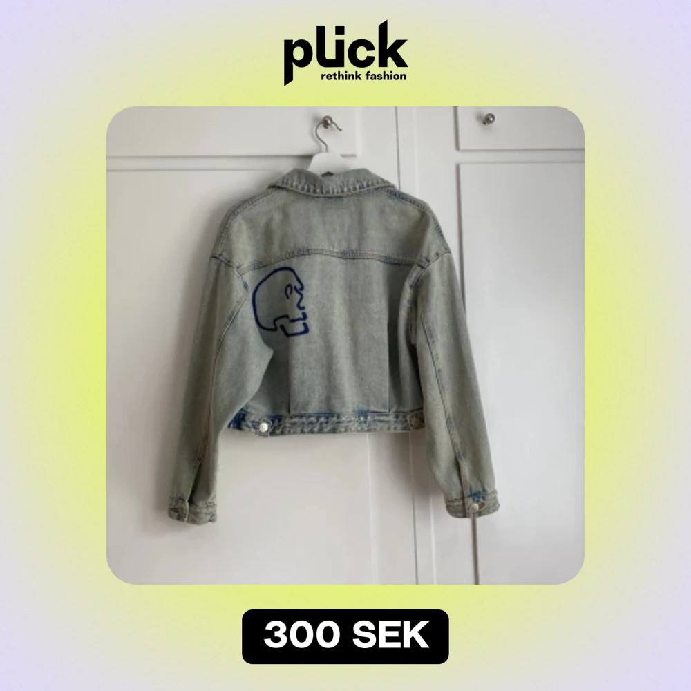 Jätte snygg jeansjacka med as coolt målat tryck! Dödskalle på ryggen och blixtar på framsidan. Är storlek S-M