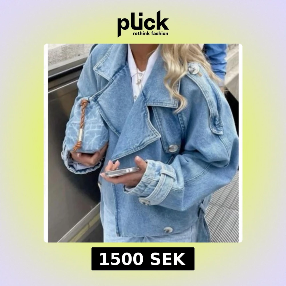 Säljer en ljusblå oversized jeansjacka från Meotine. Jackan har breda slag, dubbelknäppning, bälte i midjan och stora fickor. Snygga detaljer med knappar på ärmslut och axlar. Perfekt för dig som gillar en chill och trendig look. Kom med prisförslag!