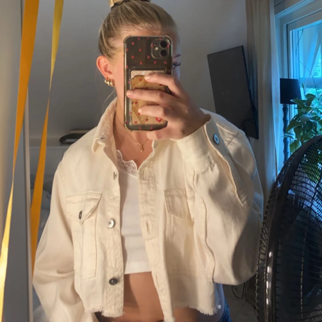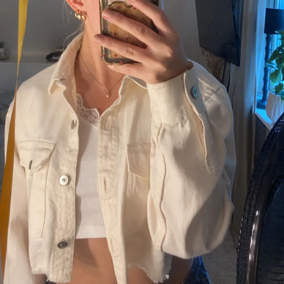 Vit kort jeans jacka. Jättefin men kommer inte till användning så därför säljer jag den. Storlek XS💗