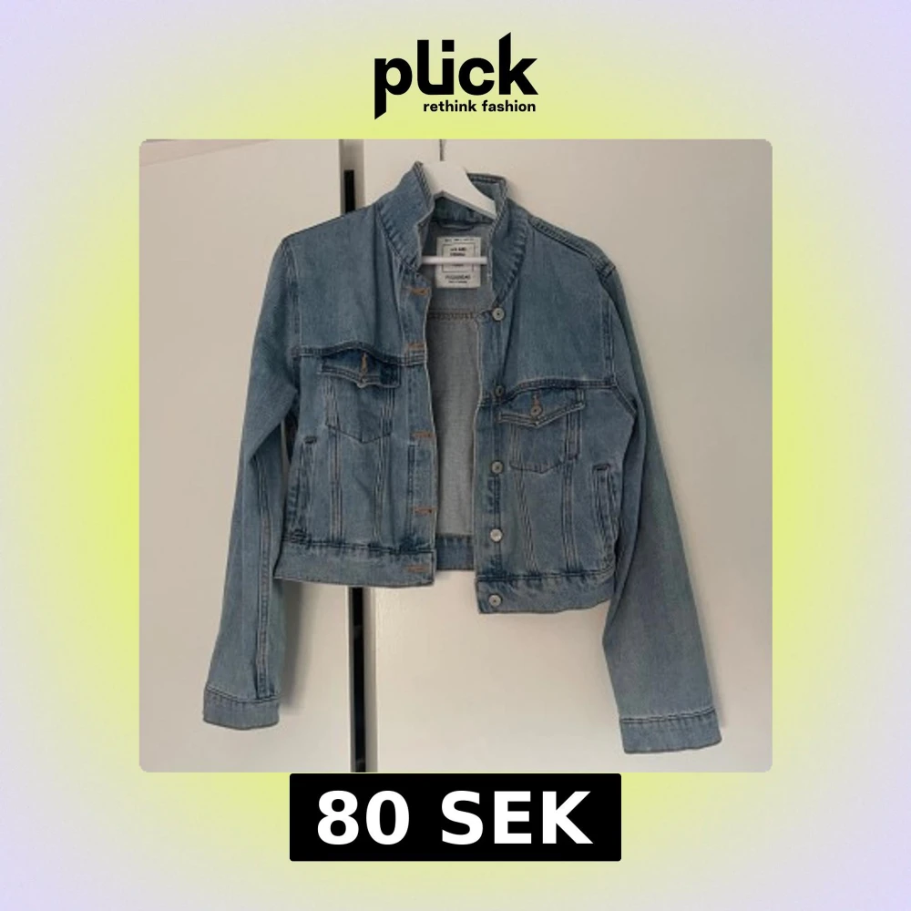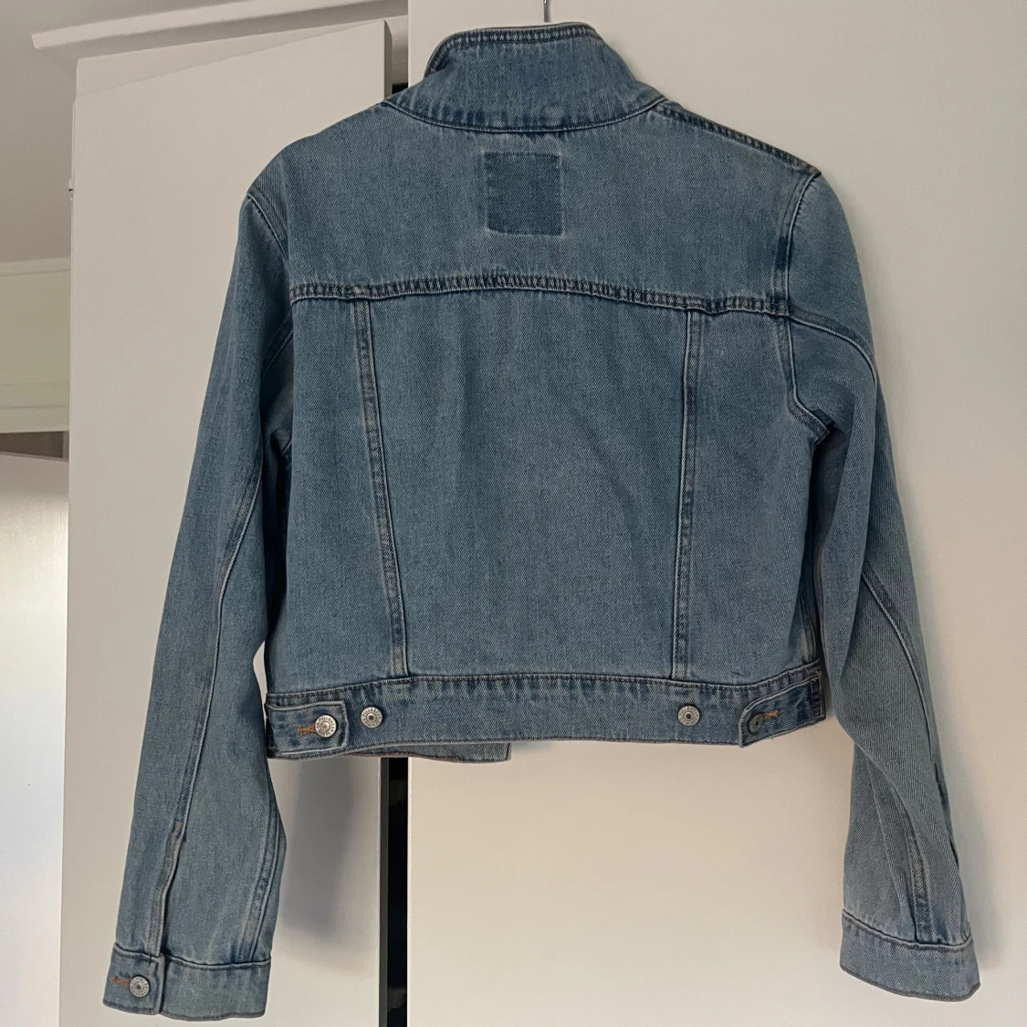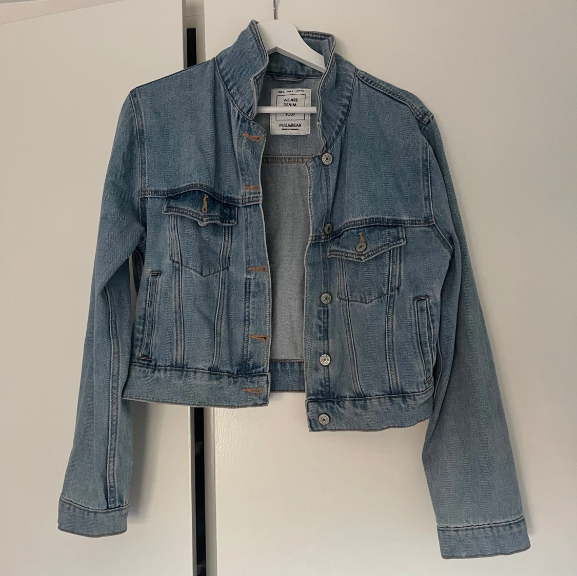 Ljusblå jeansjacka från Pull&Bear med klassisk krage, två bröstfickor med knapp och silverfärgade knappar framtill. Storleken är L, men i praktiken så är det M. 100% bomull