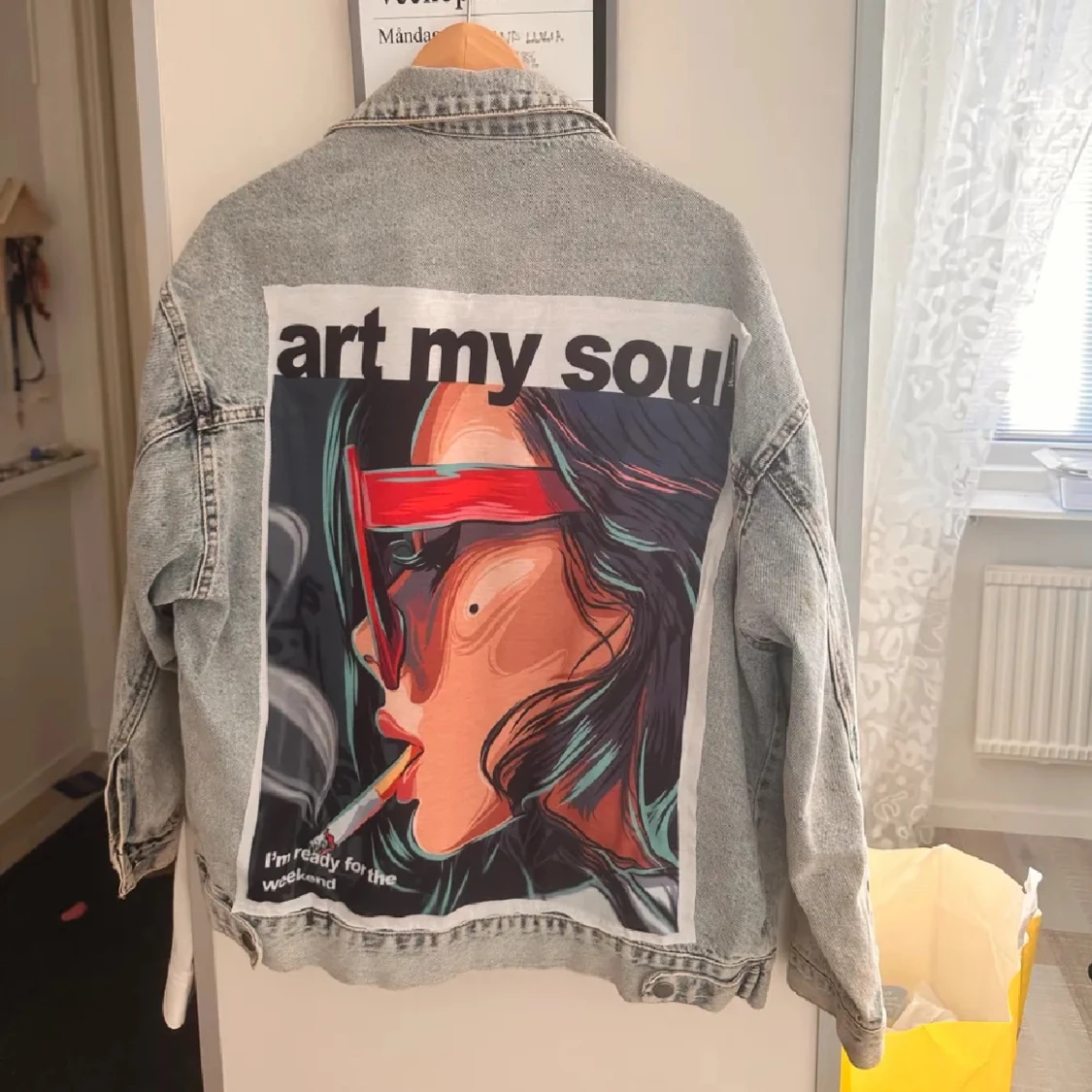 Säljer en grå jeansjacka med coolt grafiskt tryck ordinarie pris 1700kr
