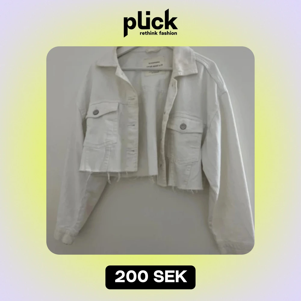 Säljer en vit, kort jeansjacka från Stradivarius i storlek S. Den är knappt använd och i toppskick – perfekt för en fräsch och trendig stil!