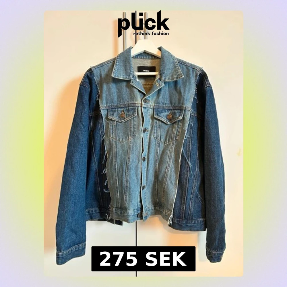 Unik jeansjacka från Weekday med patchwork-design i två olika blå nyanser. Jackan har råa kanter, klassisk krage, bröstfickor med knappar och knappstängning framtill. Oversized passform för en avslappnad look. Perfekt för dig som vill sticka ut. Storlek: M/L