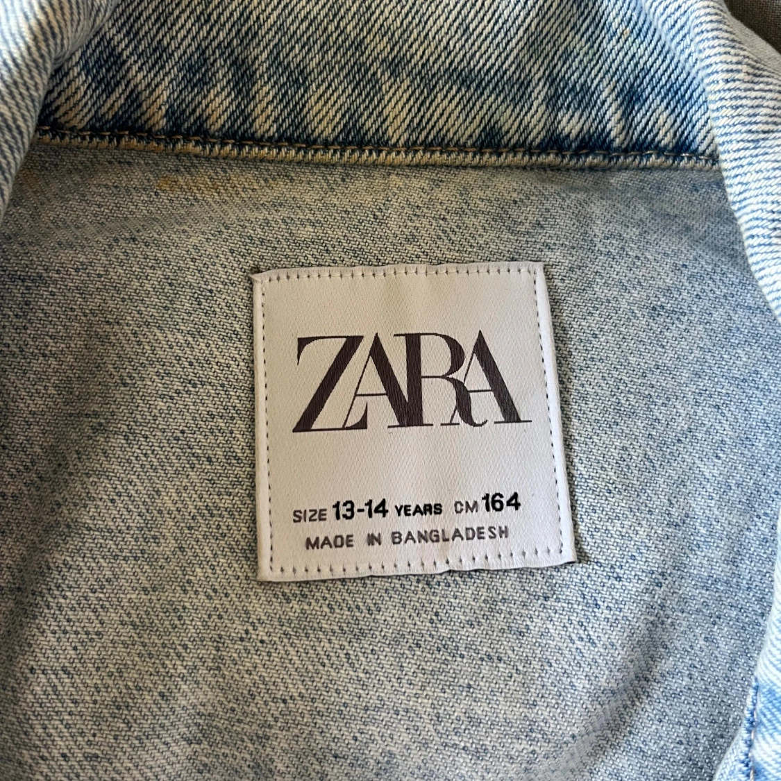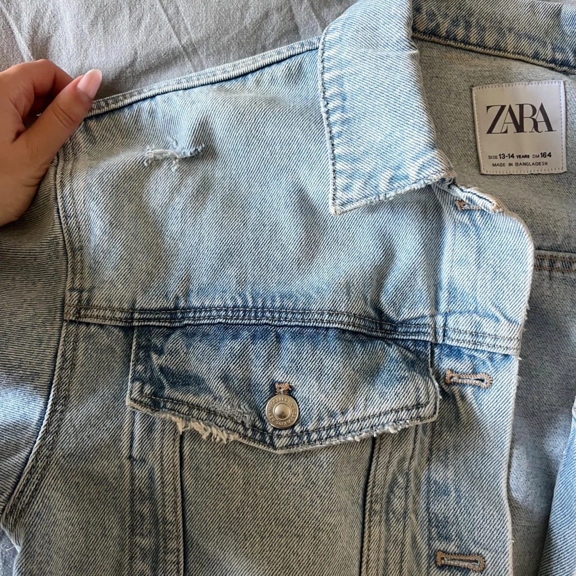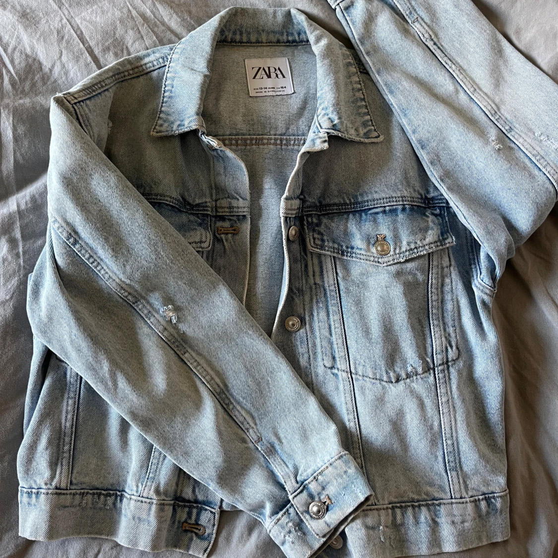 Jättesnygg jeansjacka med slitningar från Zara. Jättebra skick, använd ca en gång! Den är från barnavdelningen i storlek 13-14 år, skulle säga att den är som XS😇