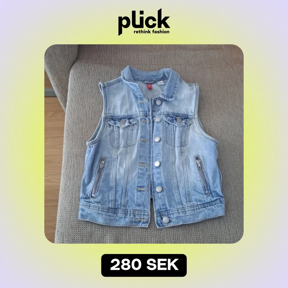 Säljer en snygg jeansväst från H&M i ljusblå denim. Västen har en klassisk krage och knäpps med silverfärgade knappar framtill. Den har två bröstfickor med knapp och två sidofickor med dragkedja. Perfekt för en avslappnad look!