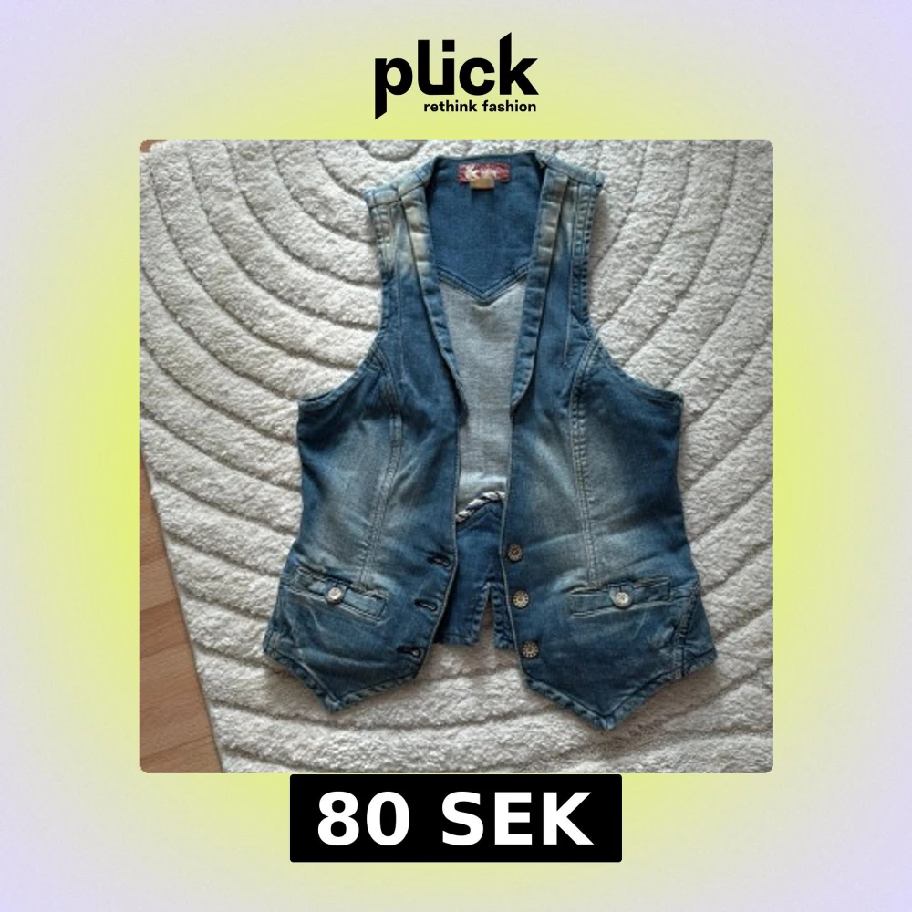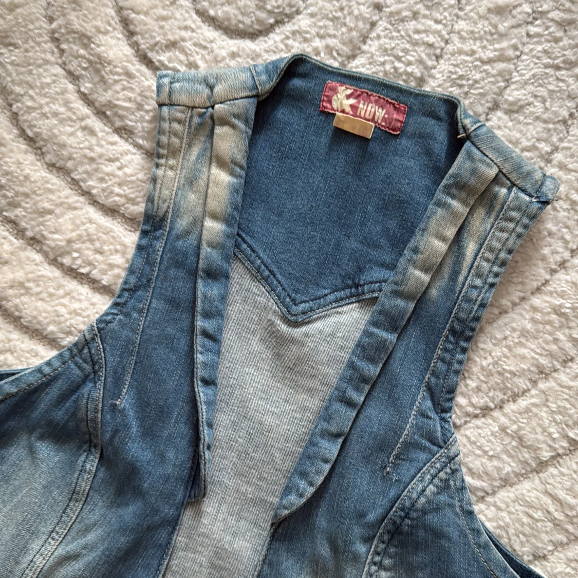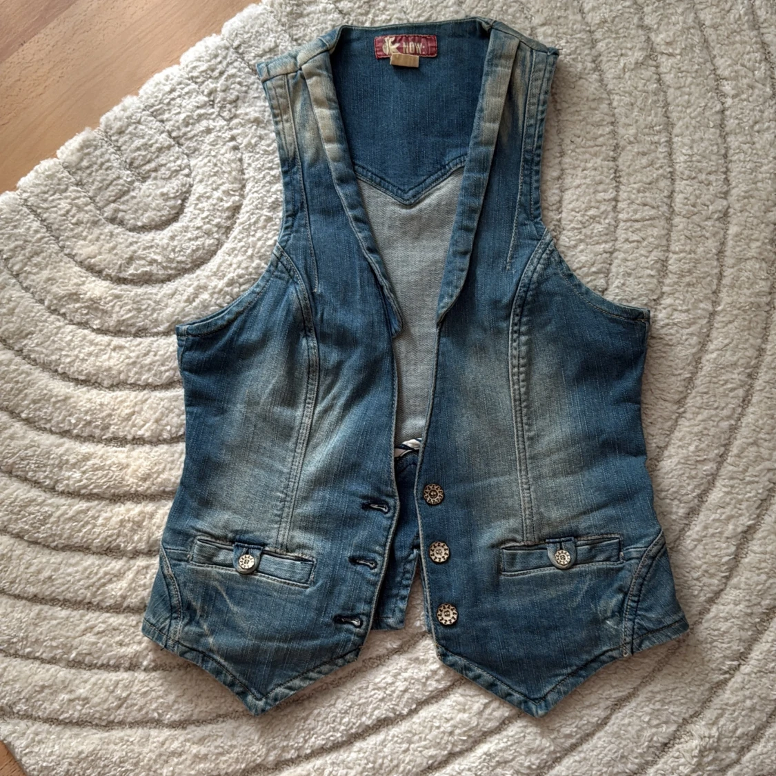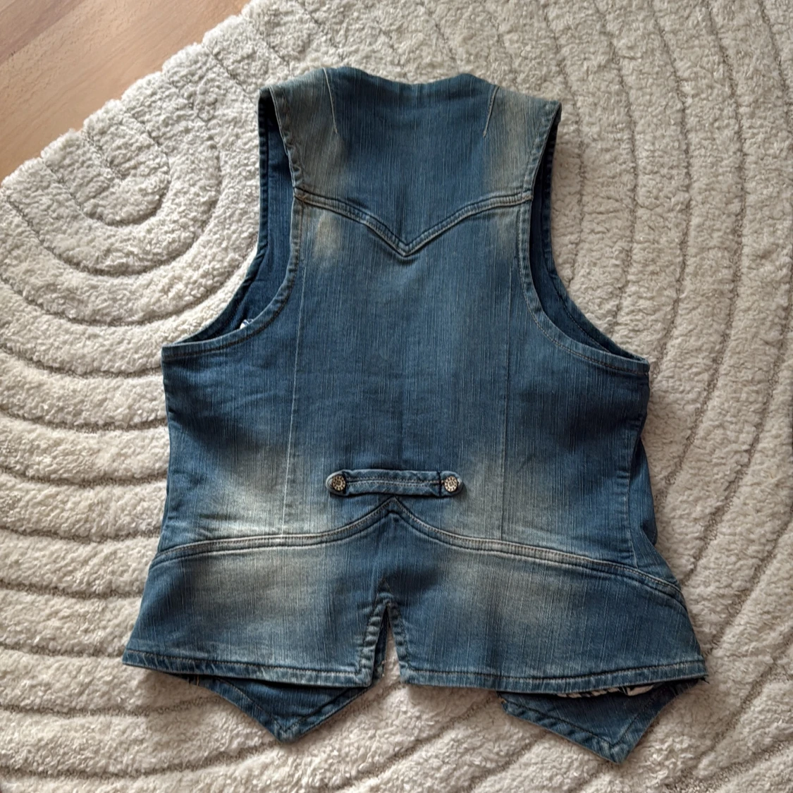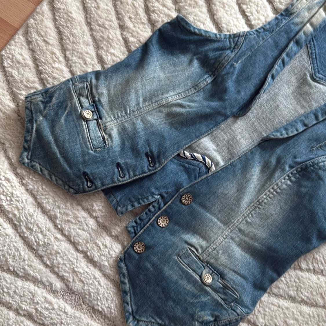 Snygg jeansväst från H&M i blå denim med slitna detaljer och dekorativa silverfärgade knappar. Västen har två fickor fram och en justerbar rem bak. Klassisk västform med spetsiga kanter nertill och ljusare partier för en vintagekänsla.