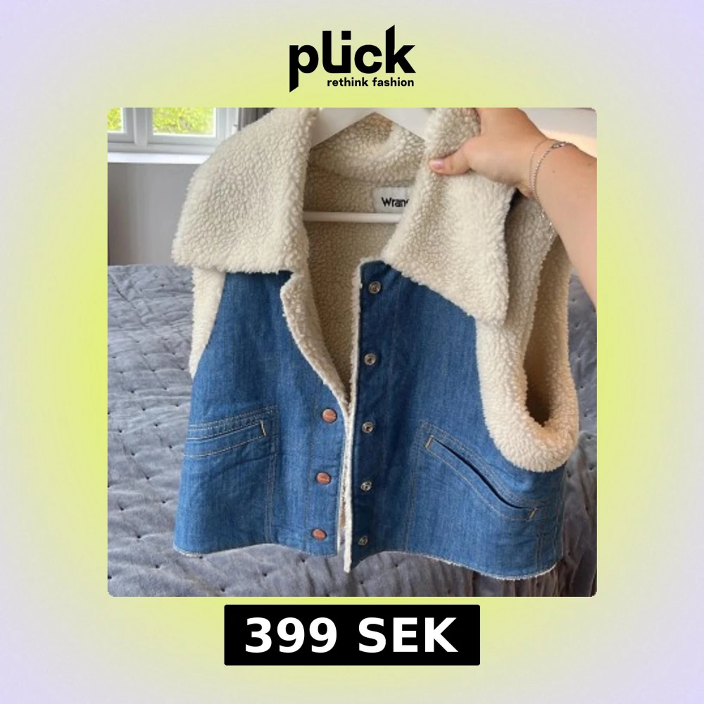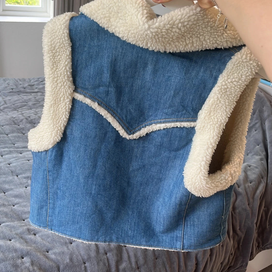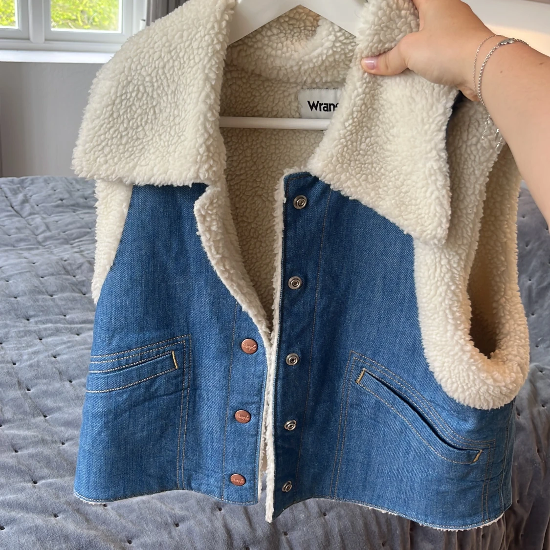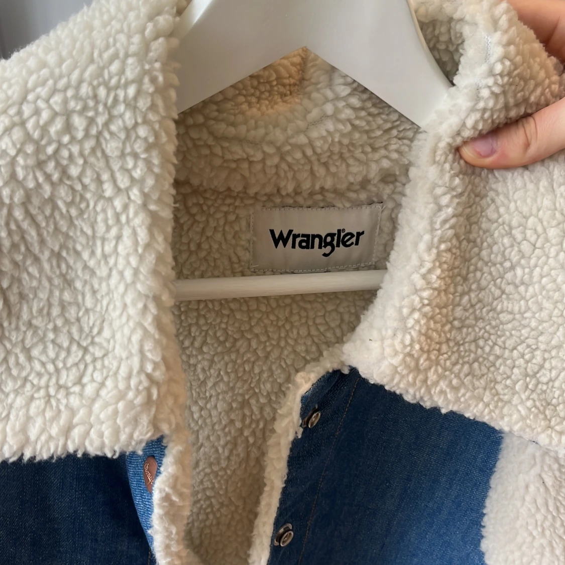 Säljer en blå jeansväst från Wrangler med mjukt vitt teddyfoder och stora slag. Västen har knappar framtill och två fickor. Perfekt för lager-på-lager och ger en cool retrolook.
