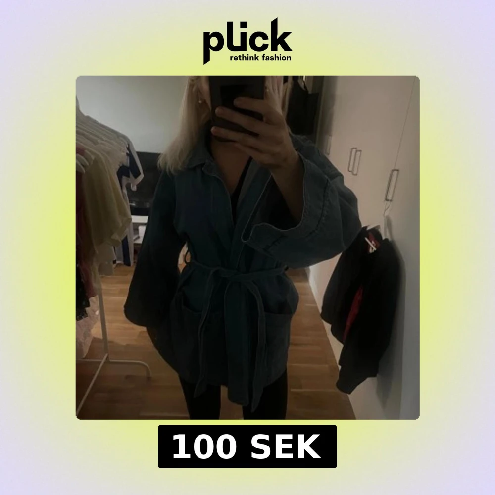 Säljer en oversized jeansjacka från NA-KD i klassisk blå denim. Jackan har breda ärmar, stora fickor och knytskärp i midjan för en avslappnad look. .