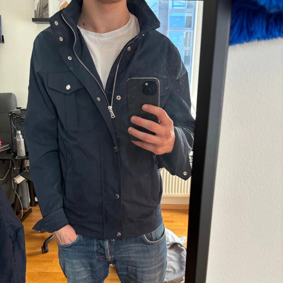 Snygg mörkblå fieldjacka från J.Lindeberg med dragkedja och tryckknappar framtill. Jackan har fyra fickor på framsidan, hög krage och en clean, stilren look. Perfekt för dig som gillar minimalistisk stil och vill ha en jacka som funkar till det mesta. Jackan är nära till nyskick då den knappt använts. Pris går att diskutera!