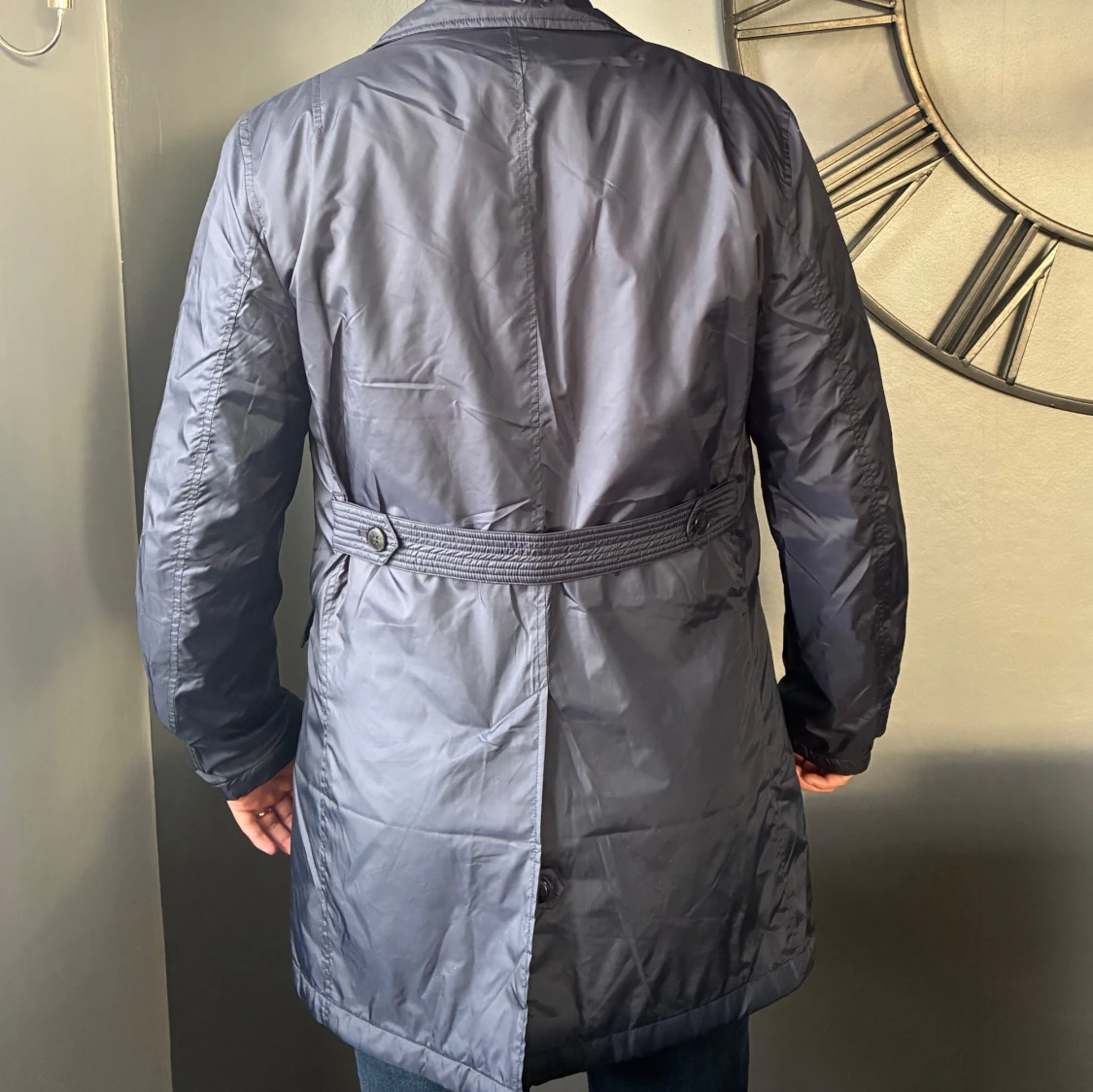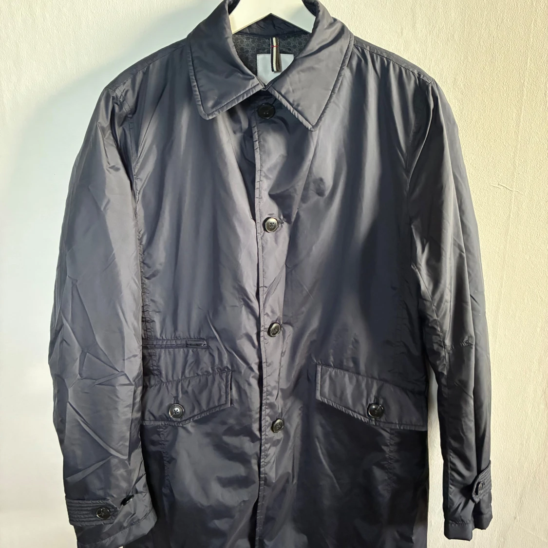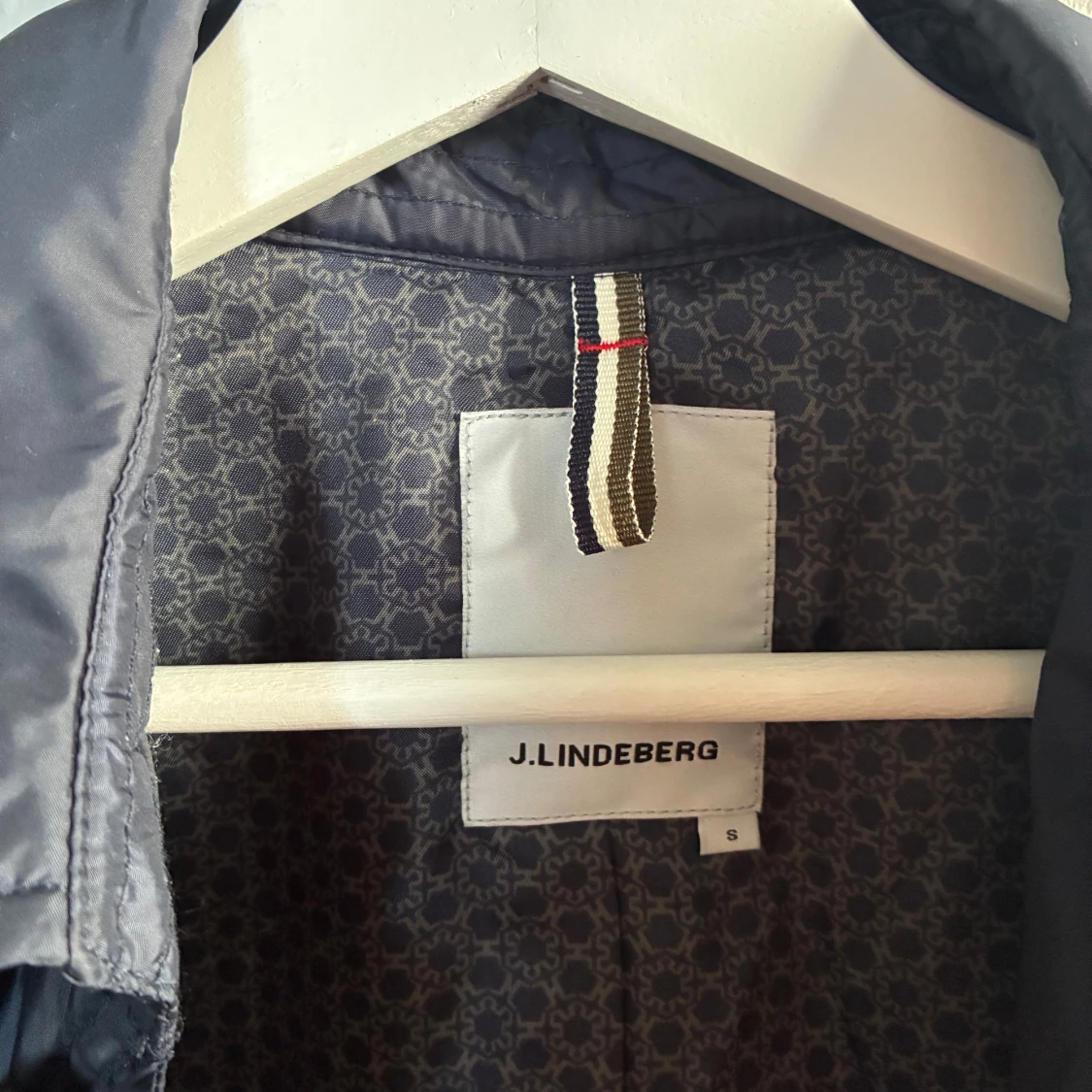 Snygg marinblå rock från J.Lindeberg i storlek S. Jackan har klassisk krage, knäppning med knappar, två fickor med lock och bälte bak. Materialet är glansig polyester och insidan har ett diskret mönster. Perfekt för dig som gillar stilrena och moderna plagg. Storleken är någonstans mellan S och M