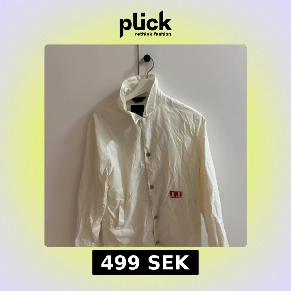 Säljer en stilren vit jacka från J.Lindeberg med knappar framtill och ett tryck på ryggen. Jackan har en hög krage och ett rött JL-märke på bröstet. Perfekt för en cool och avslappnad look.