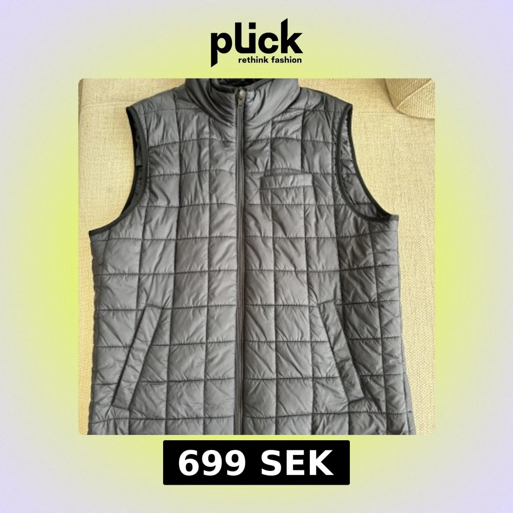 Stilren svart dunväst med rutmönster och hög krage. Är knappast använd och är i mycket bra skick