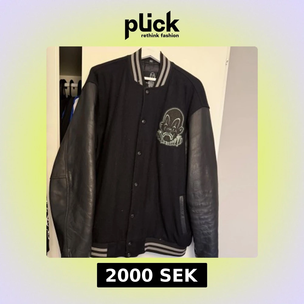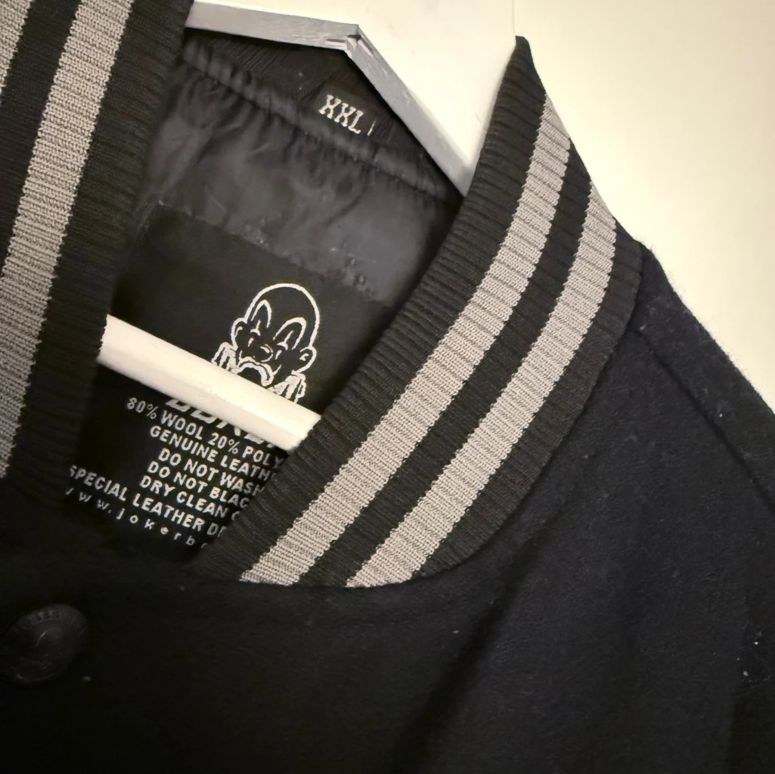 Säljer en svart bomberjacka från Joker Brand i storlek XXL. Jackan har ärmar i äkta skinn, kropp i ullblandning och gråsvarta ribbade muddar. På bröstet finns en broderad clown-logga. Klassisk collegekrage och knäppning med knappar framtill.