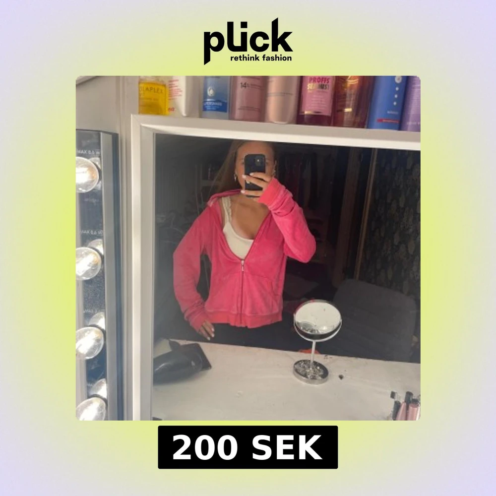 Säljer en ikonisk rosa velourjacka från Juicy Couture med dragkedja framtill och huva. Jackan har långa ärmar, två fickor och en chill, loose passform. Perfekt för dig som vill ha den där klassiska Y2K-looken.