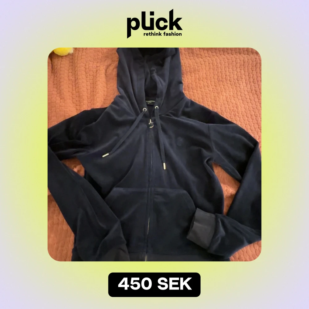 Säljer en snygg mörkblå hoodie från Juicy Couture. Den har en dragkedja framtill och en justerbar huva med snörning. Perfekt för en avslappnad stil.