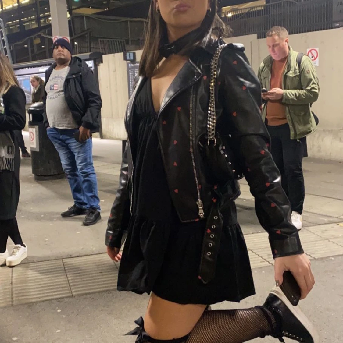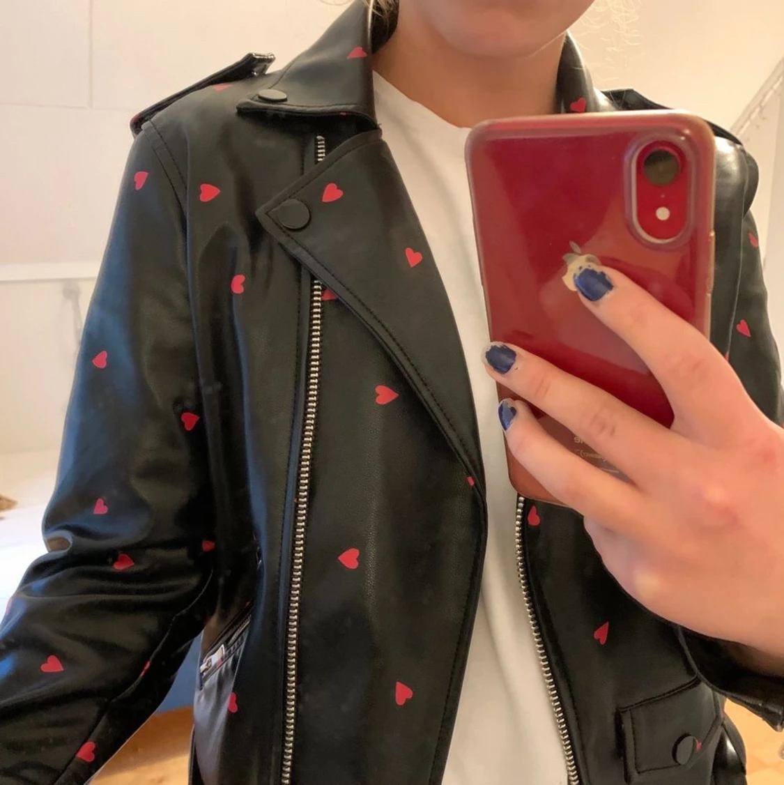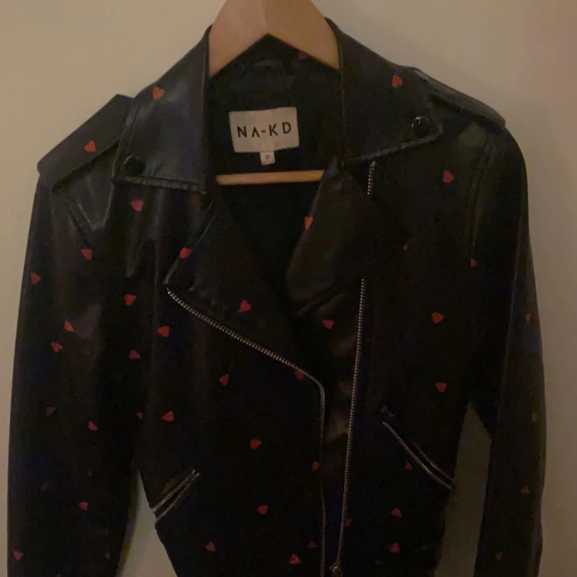 Jag säljer min fina skinnjacka med hjärtan från na kd som är helt slutsåld❤️ 2 bilden är lånad, jag minns inte nypriset men den är som ny❤️ storlek xs
