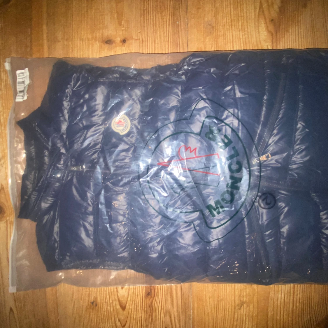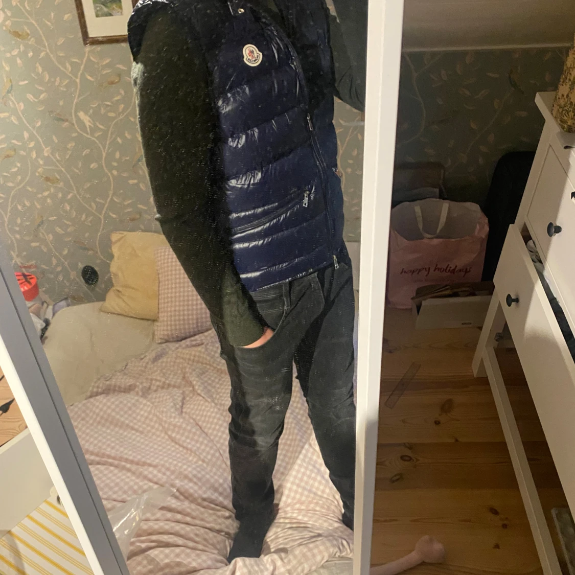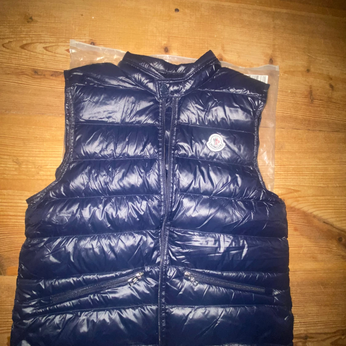 Snygg mörkblå dunväst från Moncler med glansig finish och klassisk logga på bröstet. Västen har två dragkedjefickor framtill och hög krage. Perfekt att slänga över en hoodie eller tröja för en cool lager-på-lager-look.